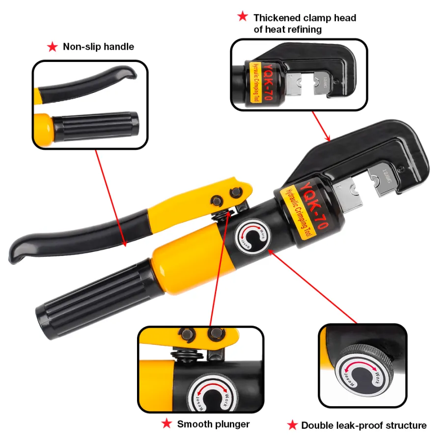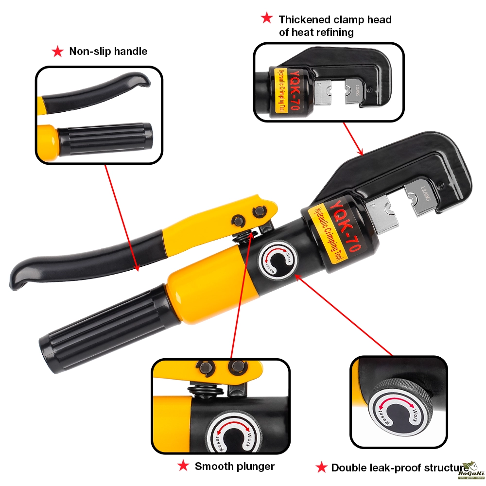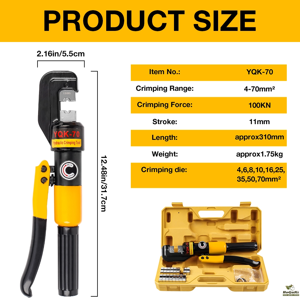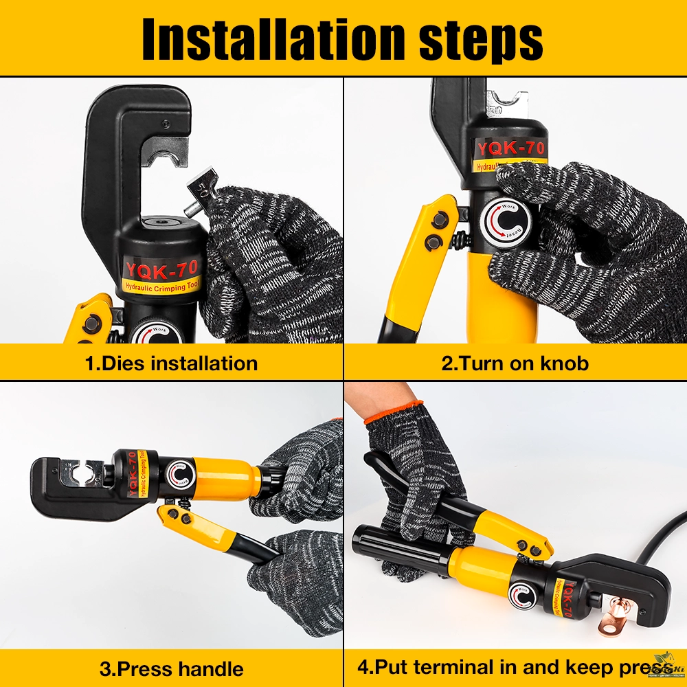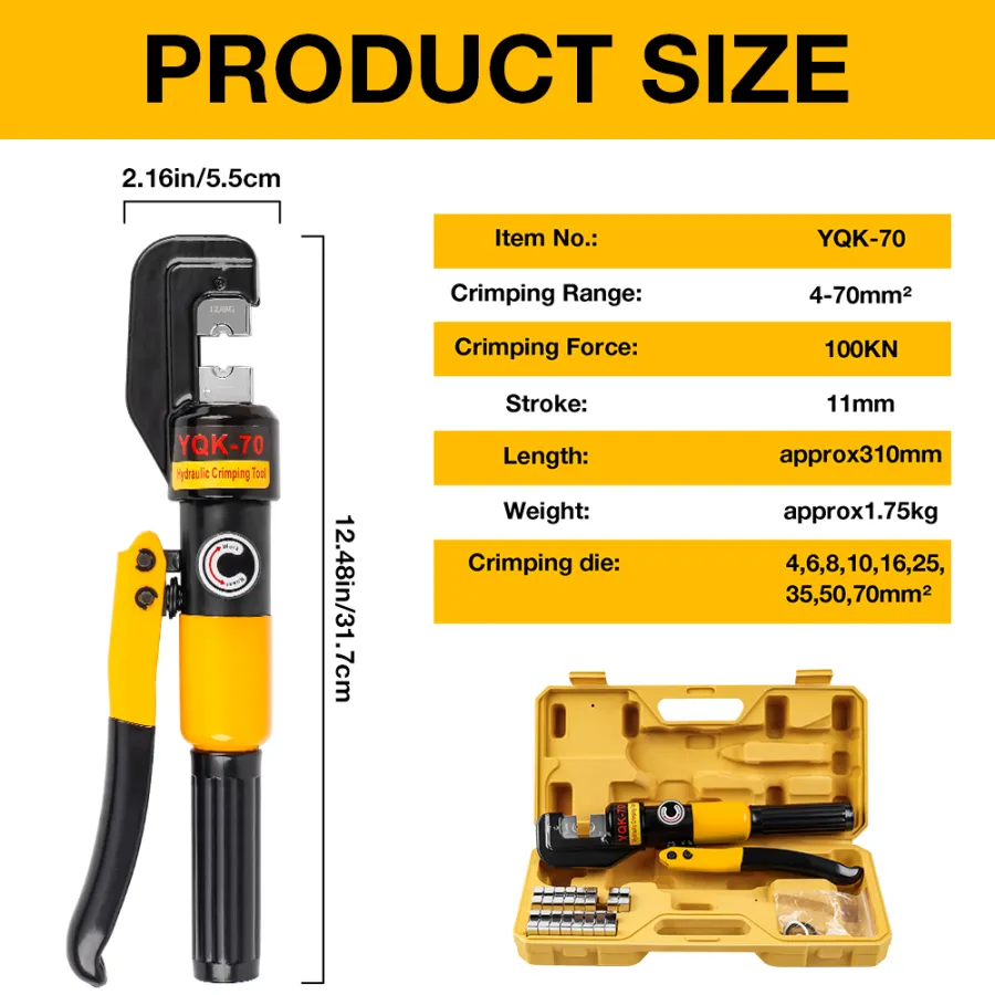 【EXCELLENT QUALITY】: YQK-70 hydraulic crimping tool made of durable materials with high strength and good toughness. Combined with the overall quenching technology, the pliers head is strong and will not break.Dies are made of hardened steel with chrome finish, crimped stainless steel fitting terminal is more tight.