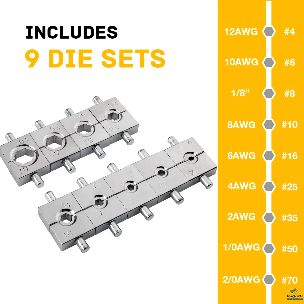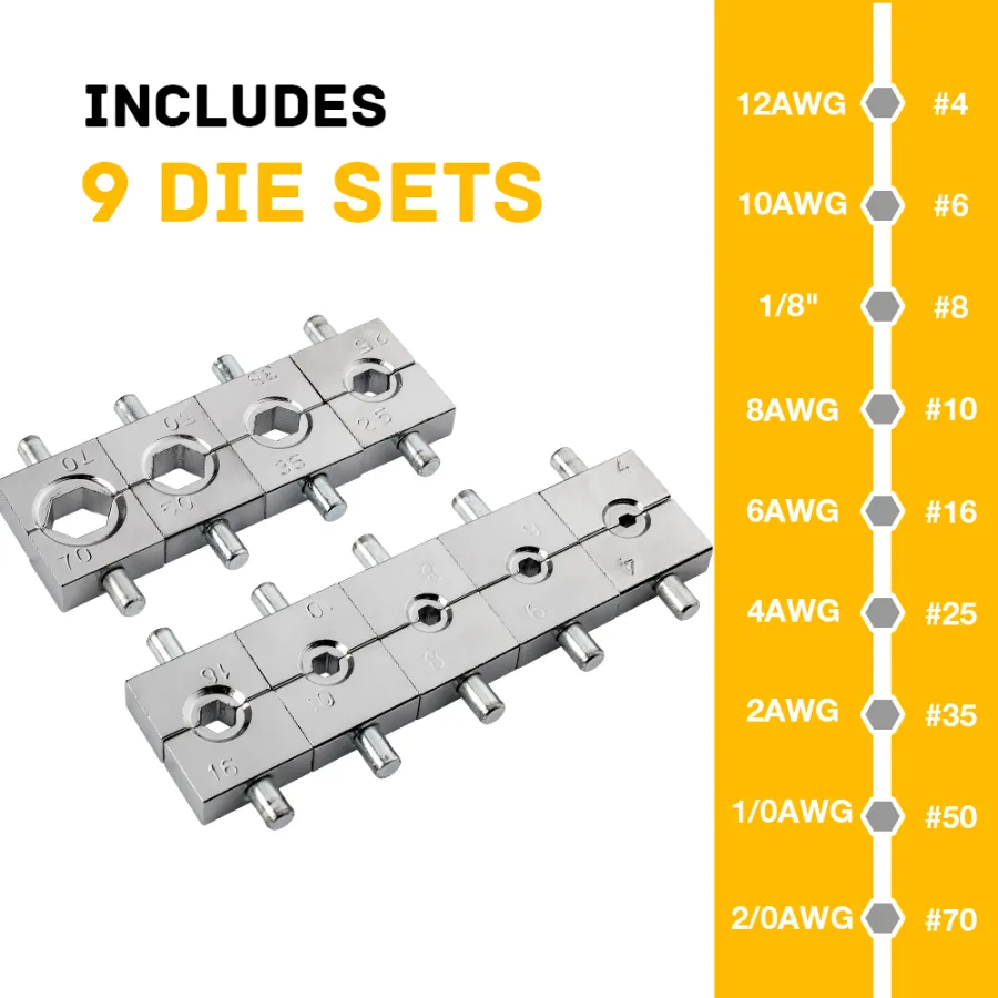 【CRIMPERS TOOL INCLUDE】: Wire crimper tool includes 9 pairs of the largest hexagon crimping dies:#4, #6, #8, #10, #16, #25, #35, #50, #70mm² (12, 10, 8, 6, 4, 2, 1/0, 2/0AWG)for crimpingfor cable railing kits