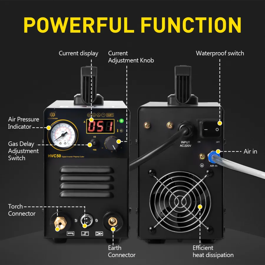 HVC-50 изготовлены по самым передовым международным инвертирующим технологиям. Частота 50 Гц/60 Гц инвертируется в высокую частоту (частота более 100 кГц) с помощью lGBT, затем происходит понижение напряжения и ток выпрямления, инверторный источник питания генерирует мощный сварочный ток постоянного тока посредством технической ШИМ. Поскольку используется инверторная технология переключения мощности, размеры и вес главного трансформатора существенно уменьшились, а эффективность возросла на 30%.