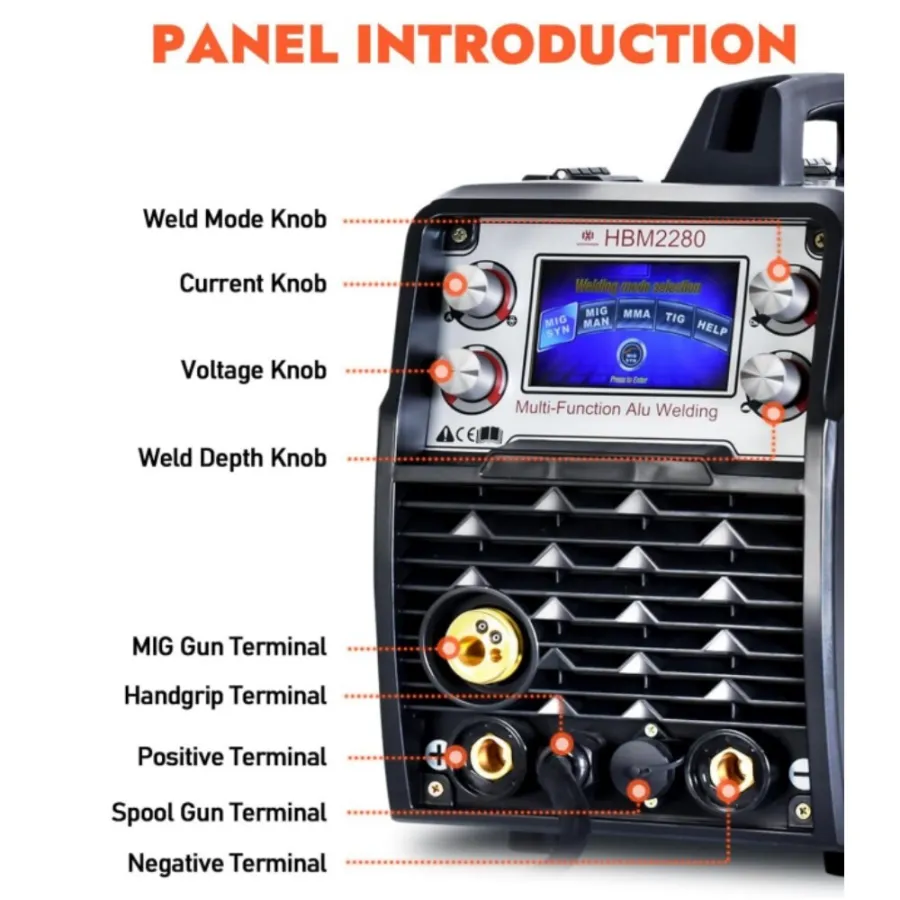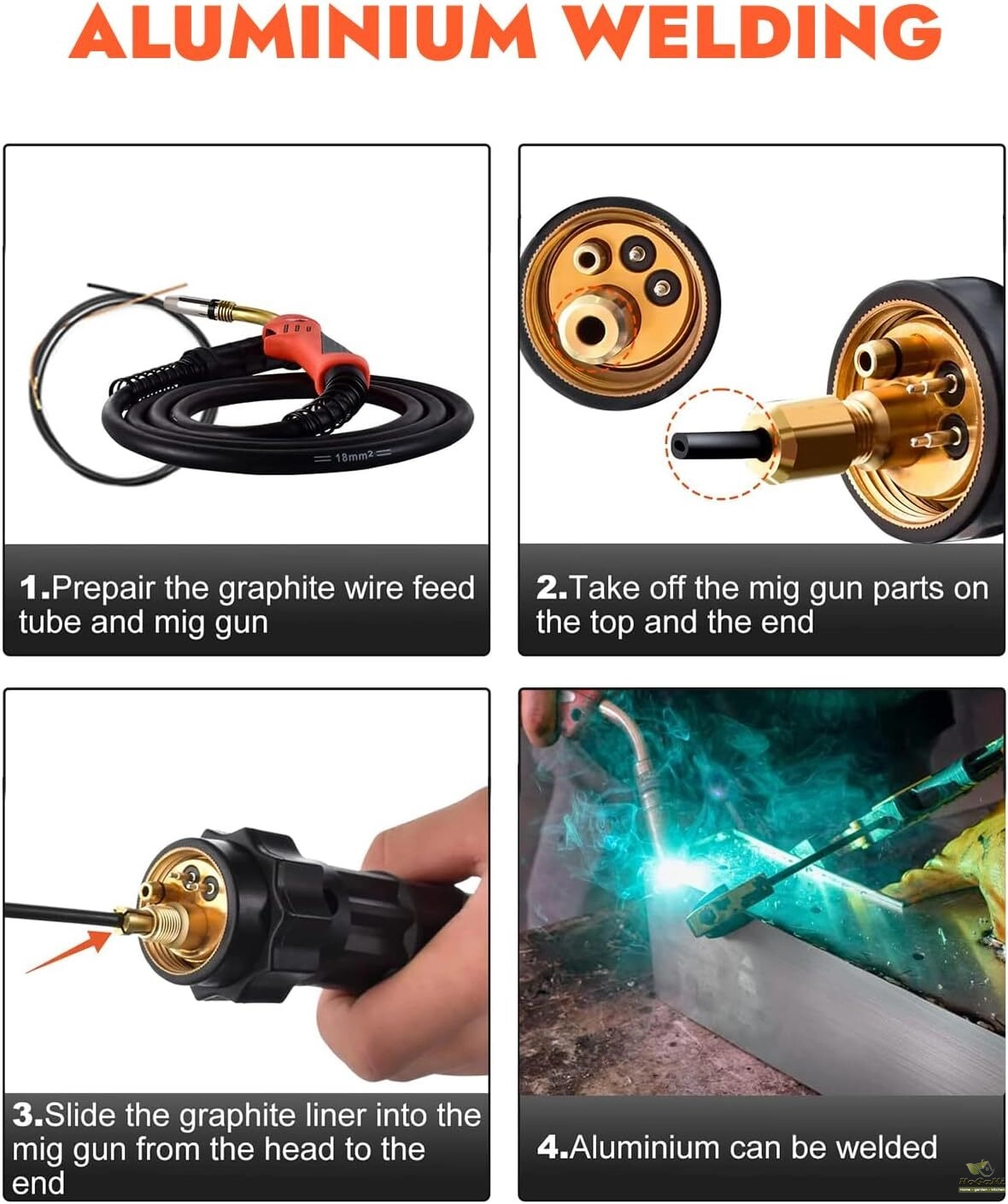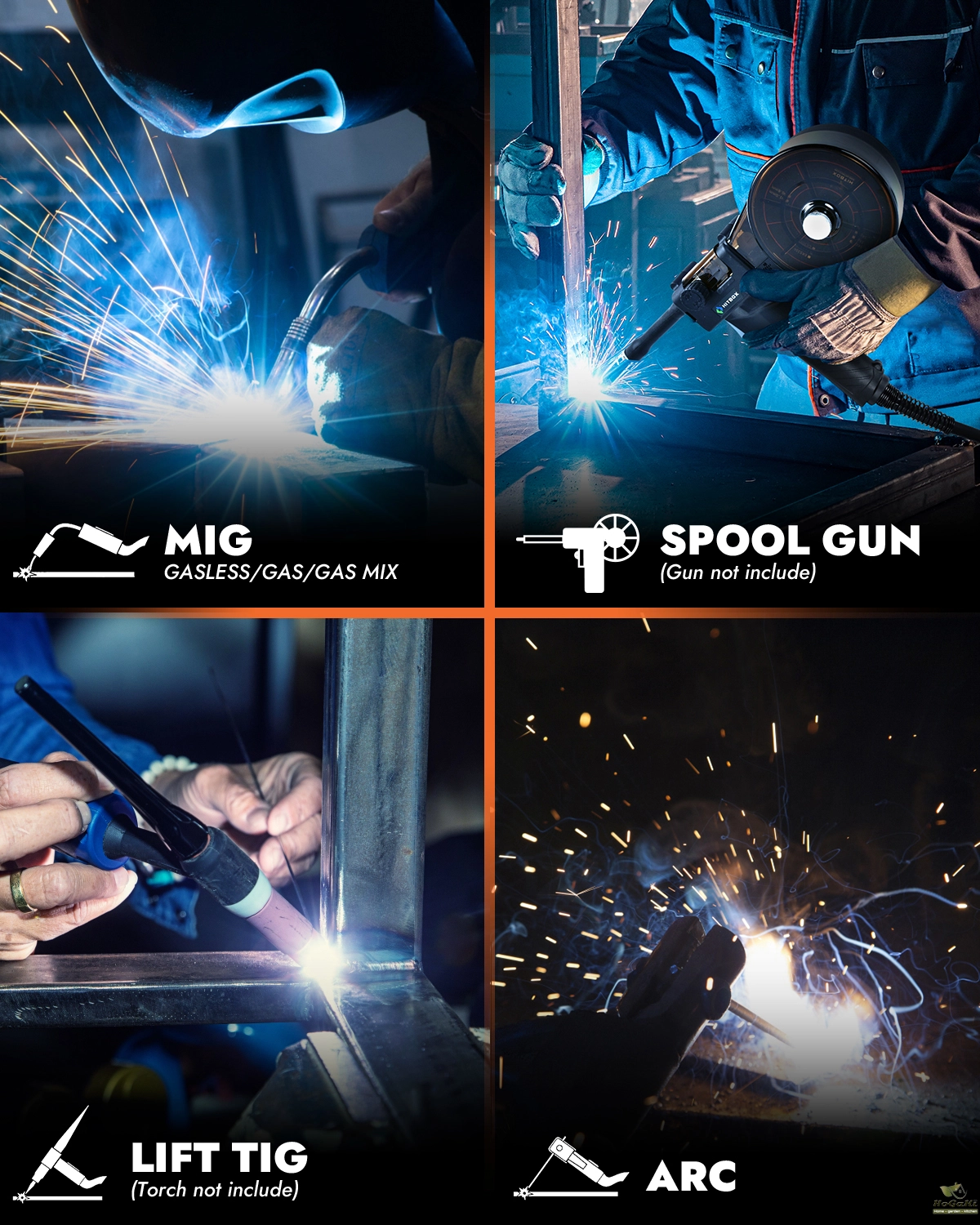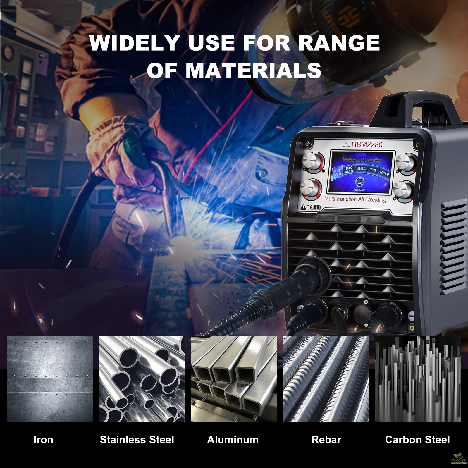 2.Can weld Aluminium - This welder can weld aluminium, iron, carbon steel, stainless steel, etc. MIG synergistic setting & MIG manual setting, Gasless Flux wire MIG Welds, stick welds, and Lift TIG welds. Dynamic control-set arc control to crisp or soft depending on your preference and application.