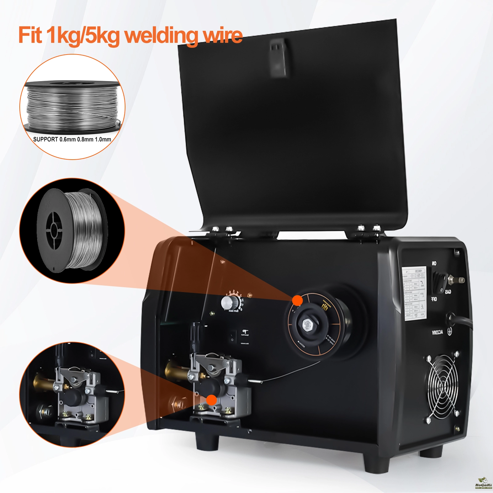 GAS (CO2) can use 0.8/ 1.0mm wire. When using 0.8mm wire, it can weld 0.9 ~ 4.8mm thickness, when using 1.0mm wire, it can weld 1.2 ~ 6.4mm thickness