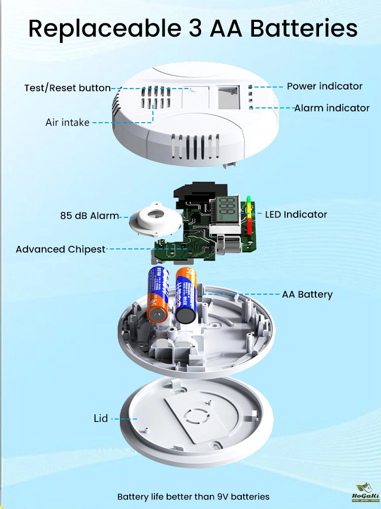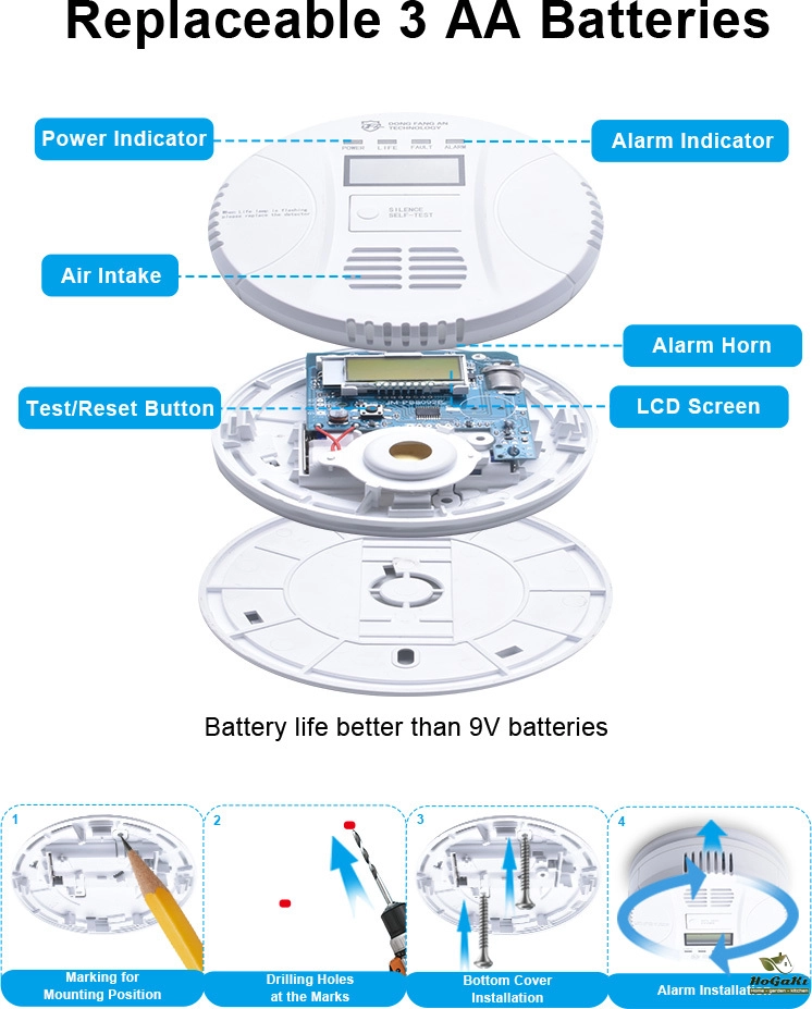 Built-in AA alkaline batteries provide continuous power for the life of the detector. The GS828A carbon monoxide alarm can be used for 10 years if the batteries are replaced regularly.