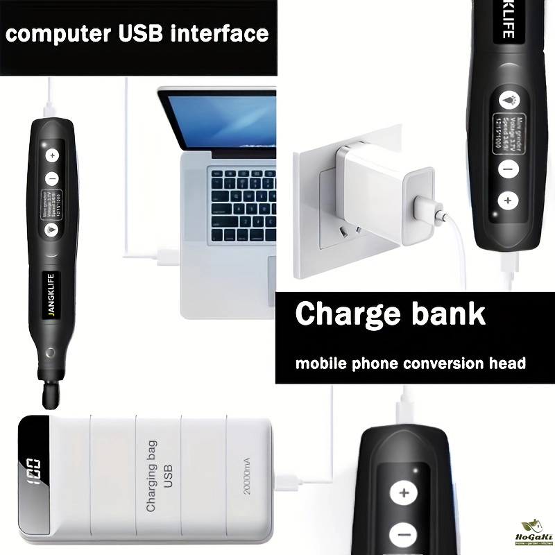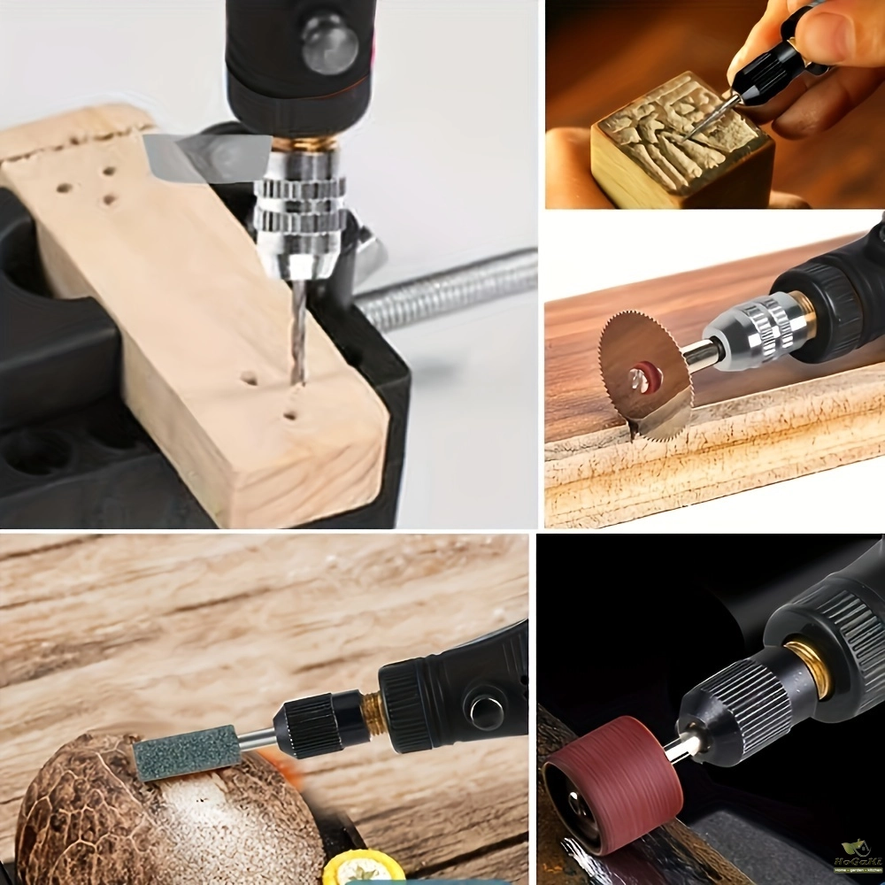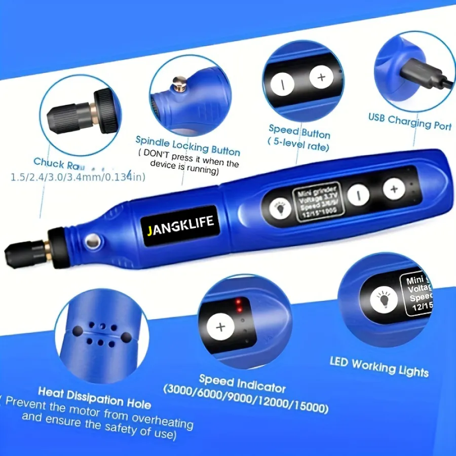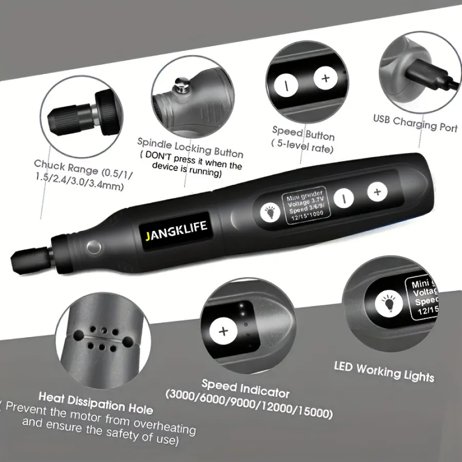 This power tool come with 5 collet sizes(1mm,1.6mm,2.35mm,3mm.3.2mm), to fits different suitable accessories and it is easily changed.