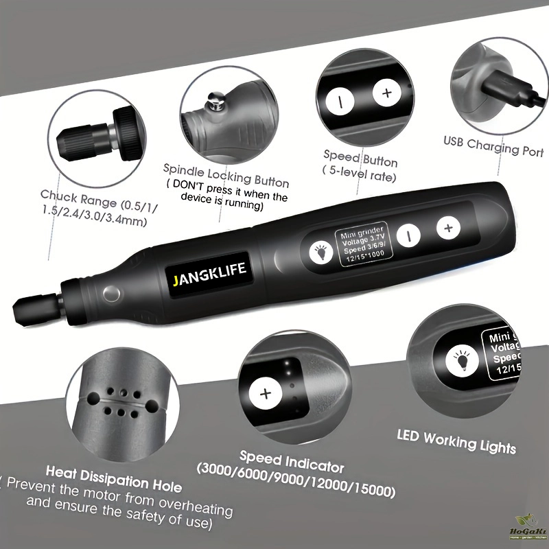 5 Rotation Speed controled by one button - 3000/6000/9000/12000/15000 rpm, shows clearly with three red light on the tool body. It can meet different tasks against your needs.