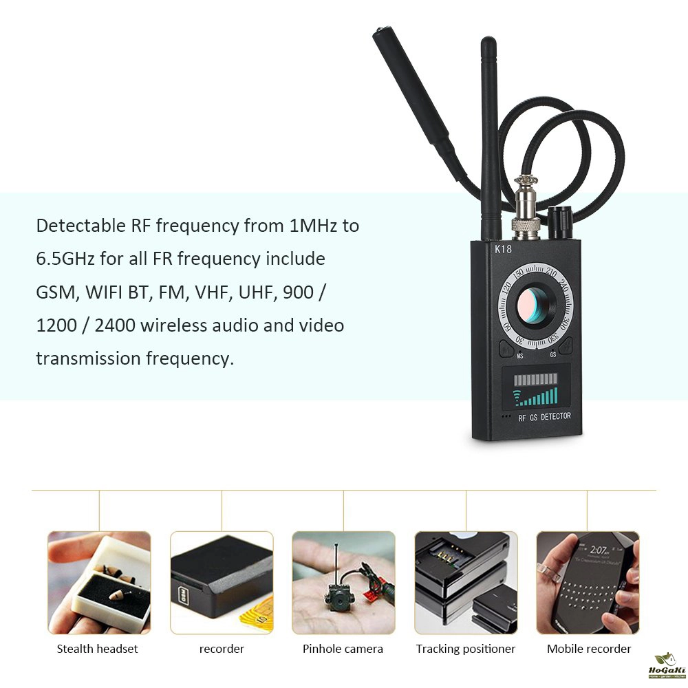 RF frequency from 1MHz to 6.5GHz for all FR frequency include GSM, WIFI BT, FM, VHF, UHF, 900 / 1200 / 2400 wireless audio and video transmission frequency.for home, office, hotel, car, bathroom, changing room, business negotiation, confidential session, factories, important workshop and research room, military installation, government agencies, entertainment venues or as a monitor for school examinations to prevent eavesdropping, being photographed, shooting videos or radiation dam