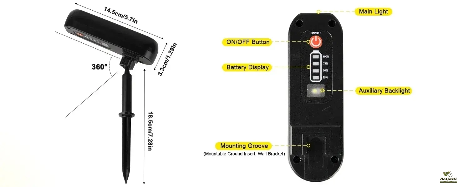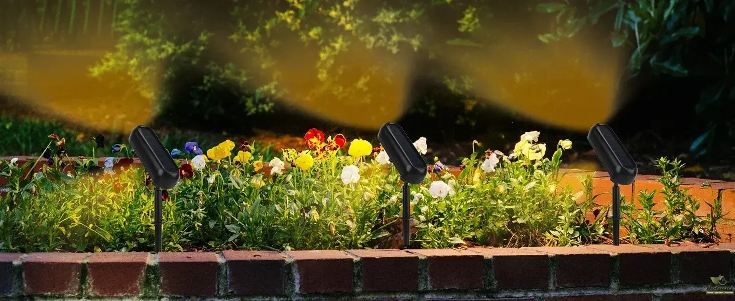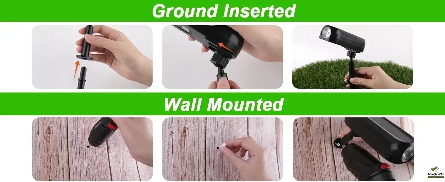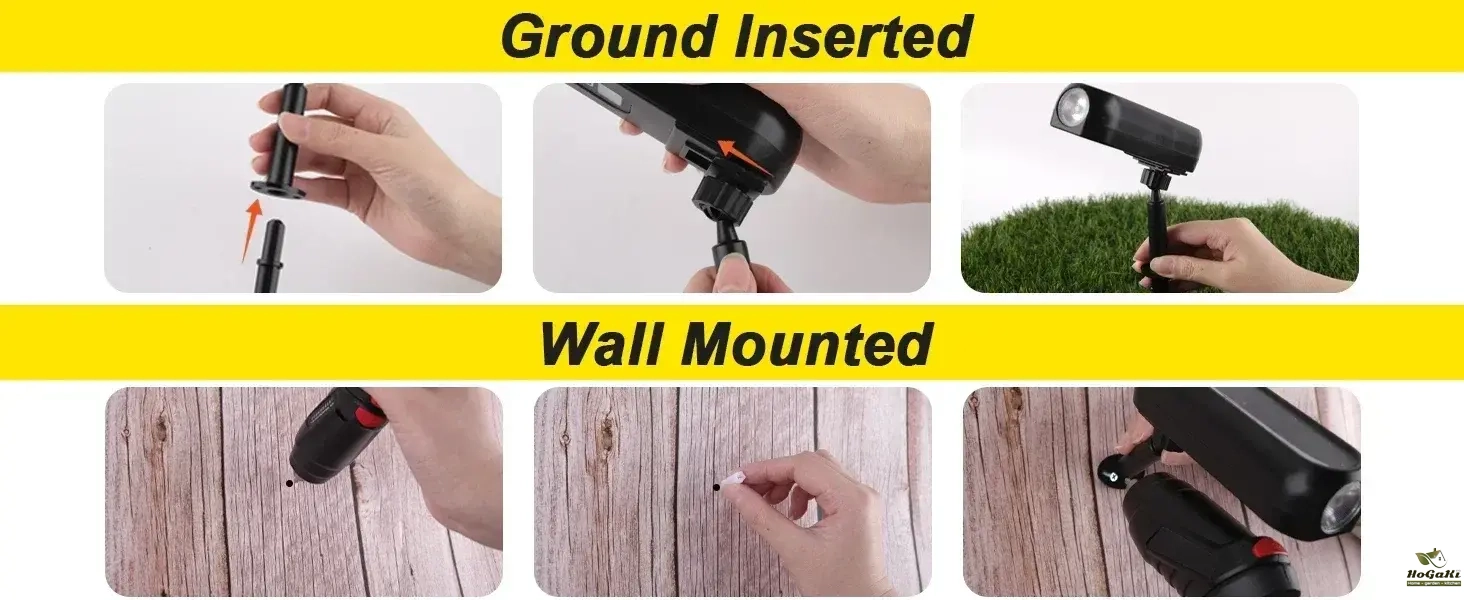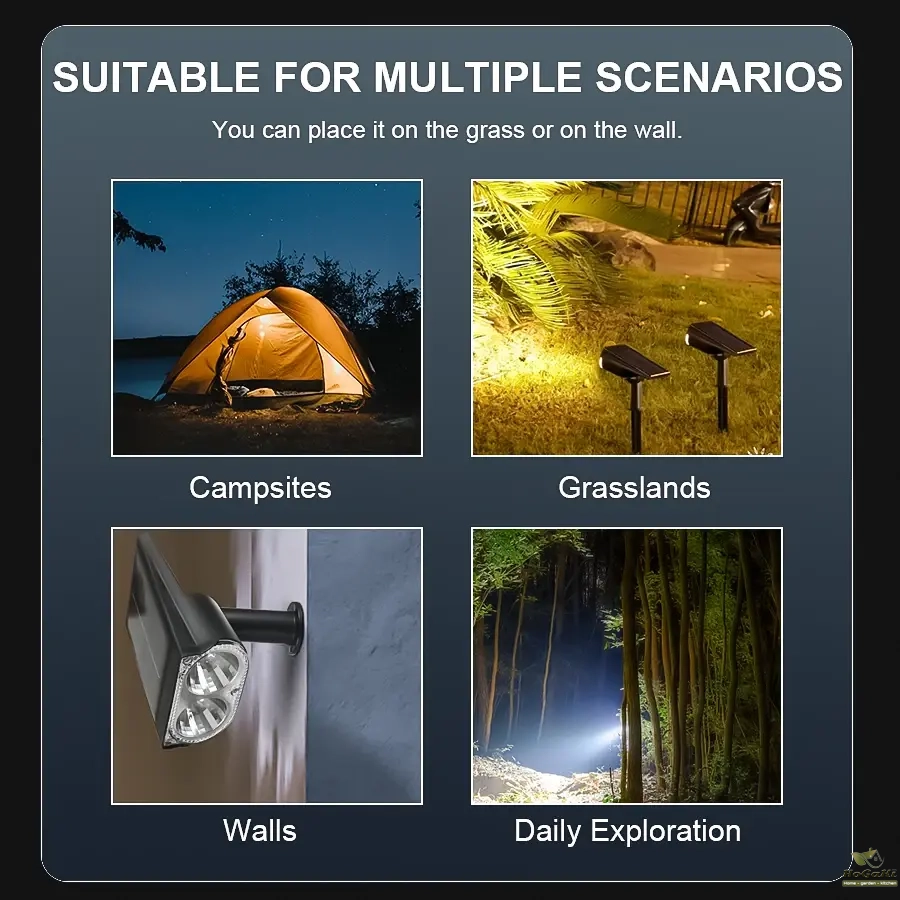 【2 Installation Options】The solar lights with 2 installation options. ① Ground Inserted, ②Wall Mounted. The solar lights can 360° adjustable, you can adjust the spot lights to lighting the area you want.