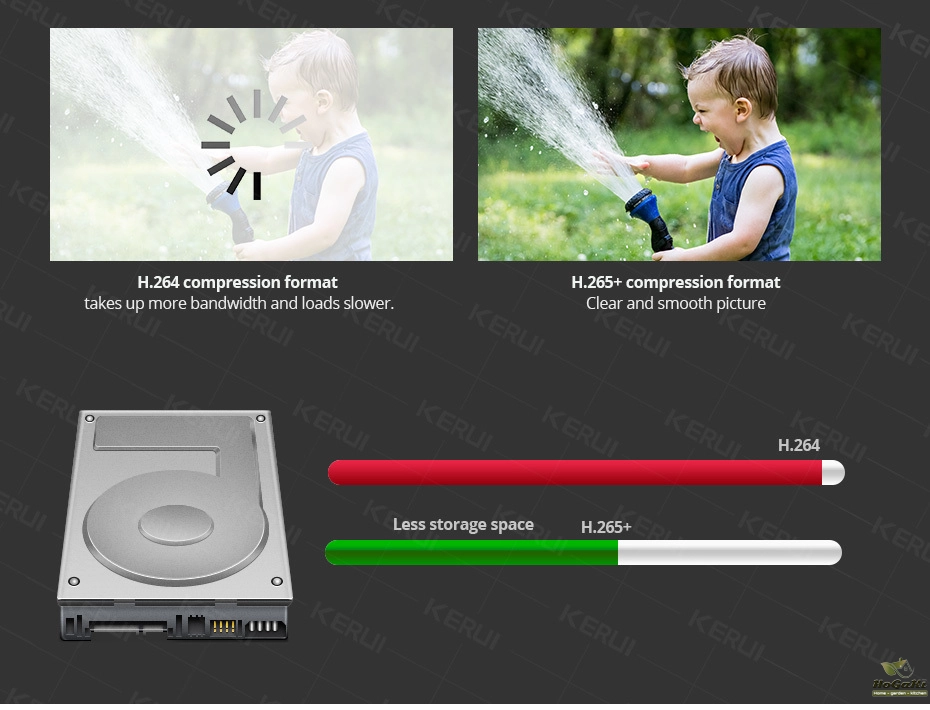 NVR Kits Adopts advanced H.265 video compression,reduces 50% file size and keep same quality compared to H.264 one.