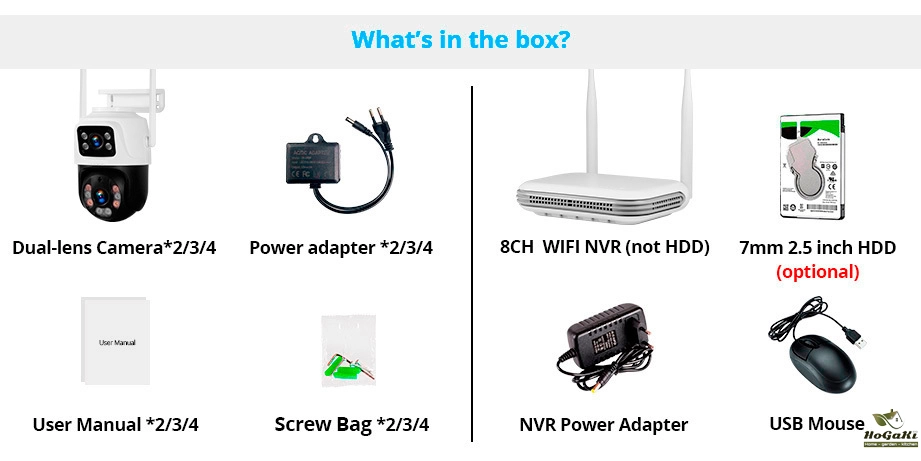 8CH WIFI NVR* 1Pieces; NVR Power Adapter* 1Pieces; USB Mouse* 1Pieces; Dual-lens Cameras* 2 /3 /4 /6 /8Pieces; Camera Power Adapter*2 /3 /4 /6 /8Pieces; 7mm 2.5 inch HDD(optional);