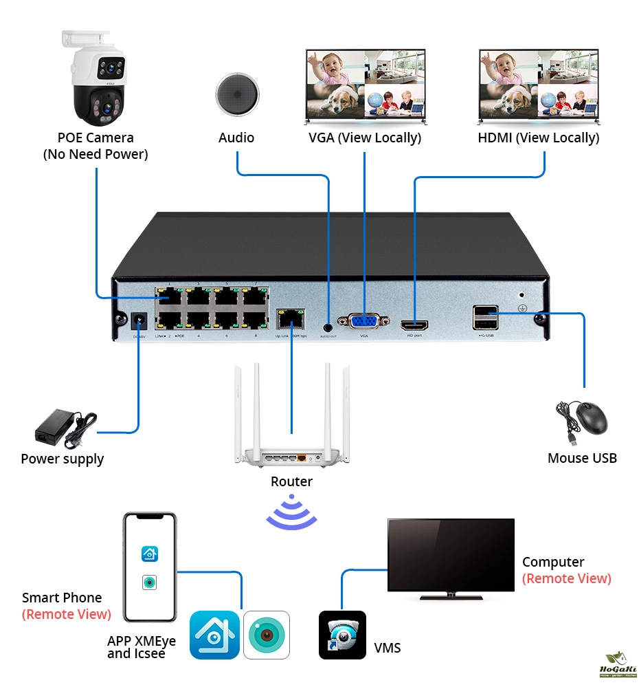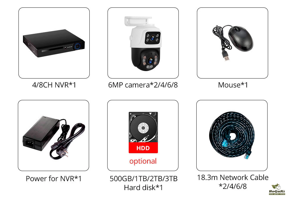 4CH/8CH POE NVR* 1Pieces; NVR Power Adapter* 1Pieces; USB Mouse* 1Pieces;6MP Dual-lens POE Cameras* 2/3/4/6/8 Pieces; 18.3m Network Cable* 2/3/4/6/8 Pieces; HDD(optional);