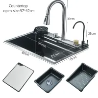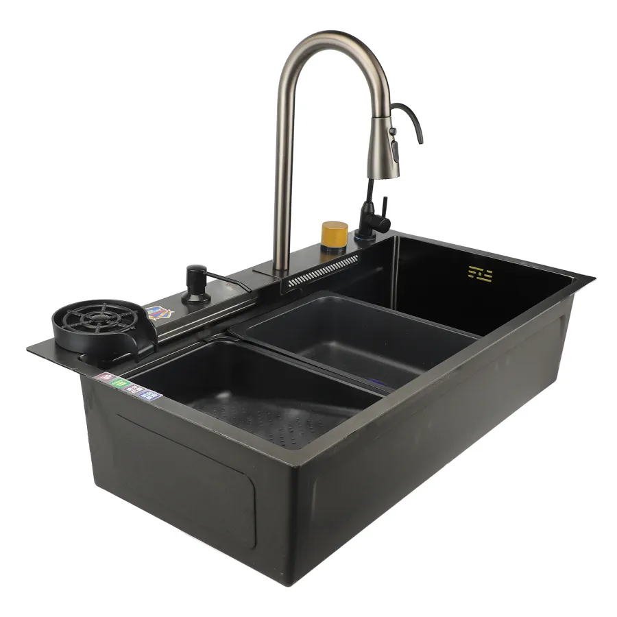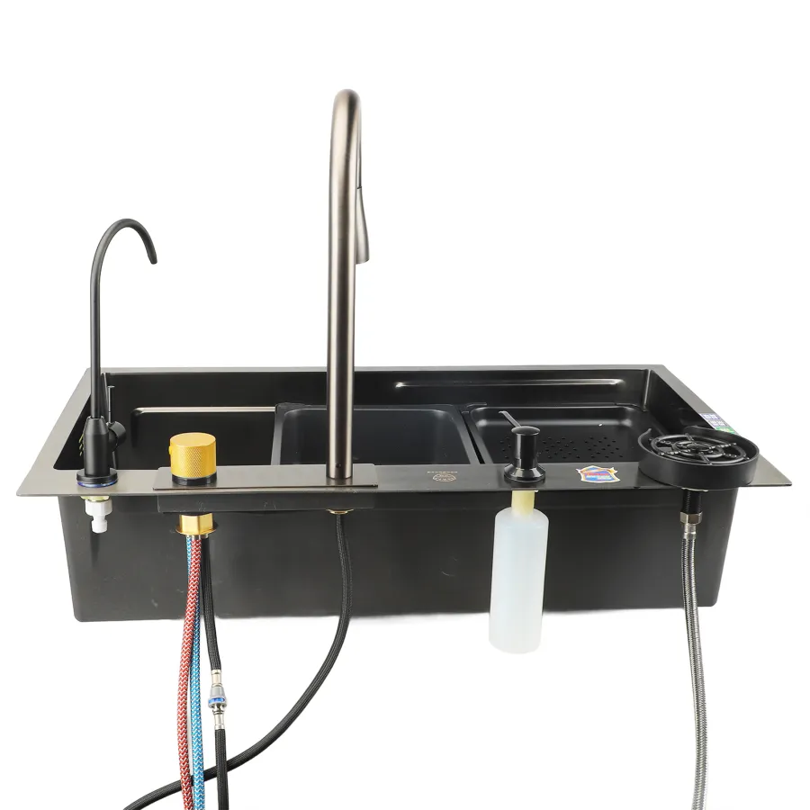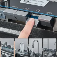 Stainless Steel Kitchen Sink with Faucet Digital Display Large Single Bowl Waterfall Rain 5 Functions System Dish Basin Sink