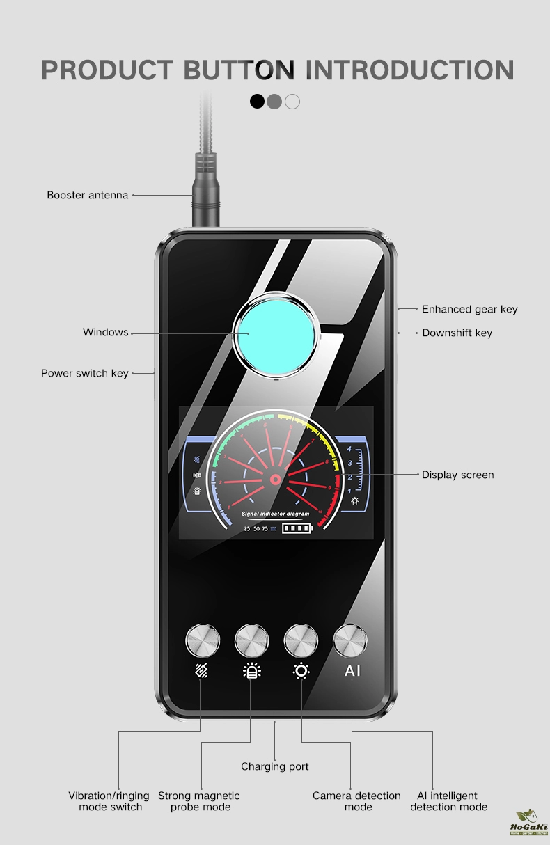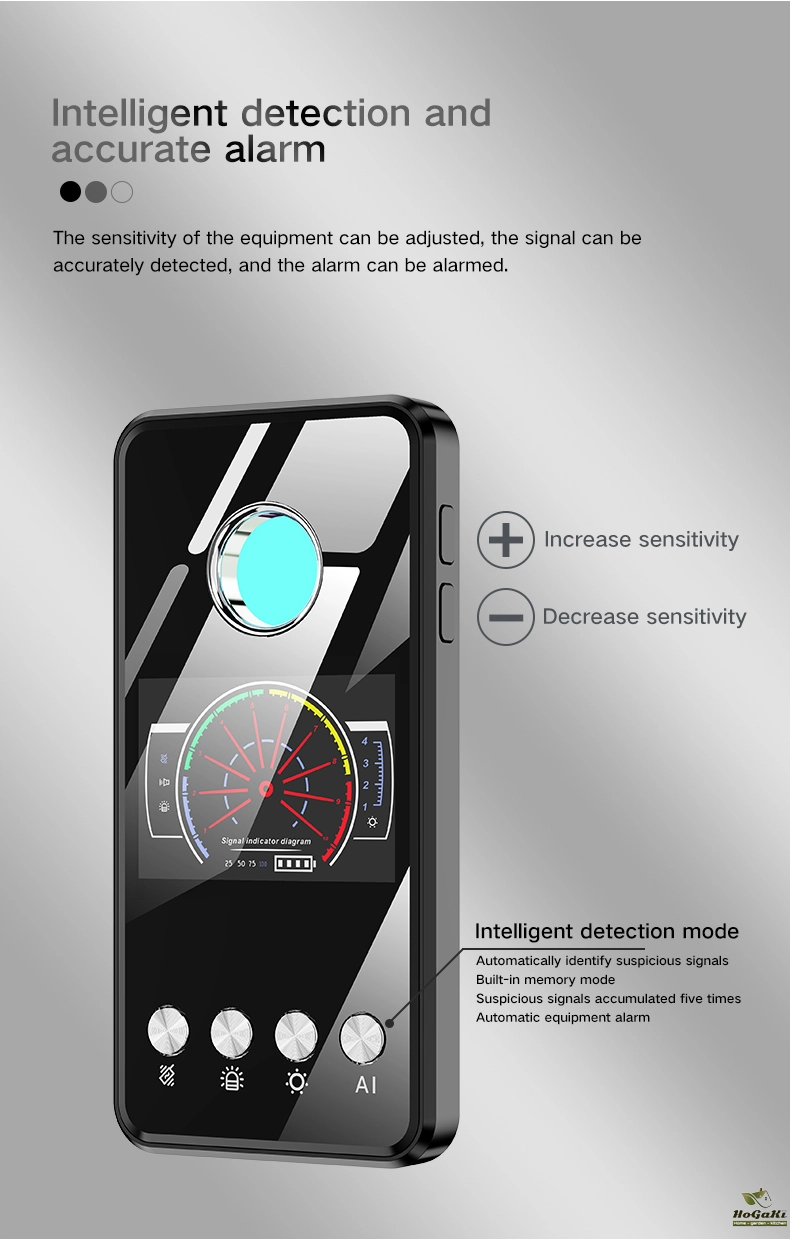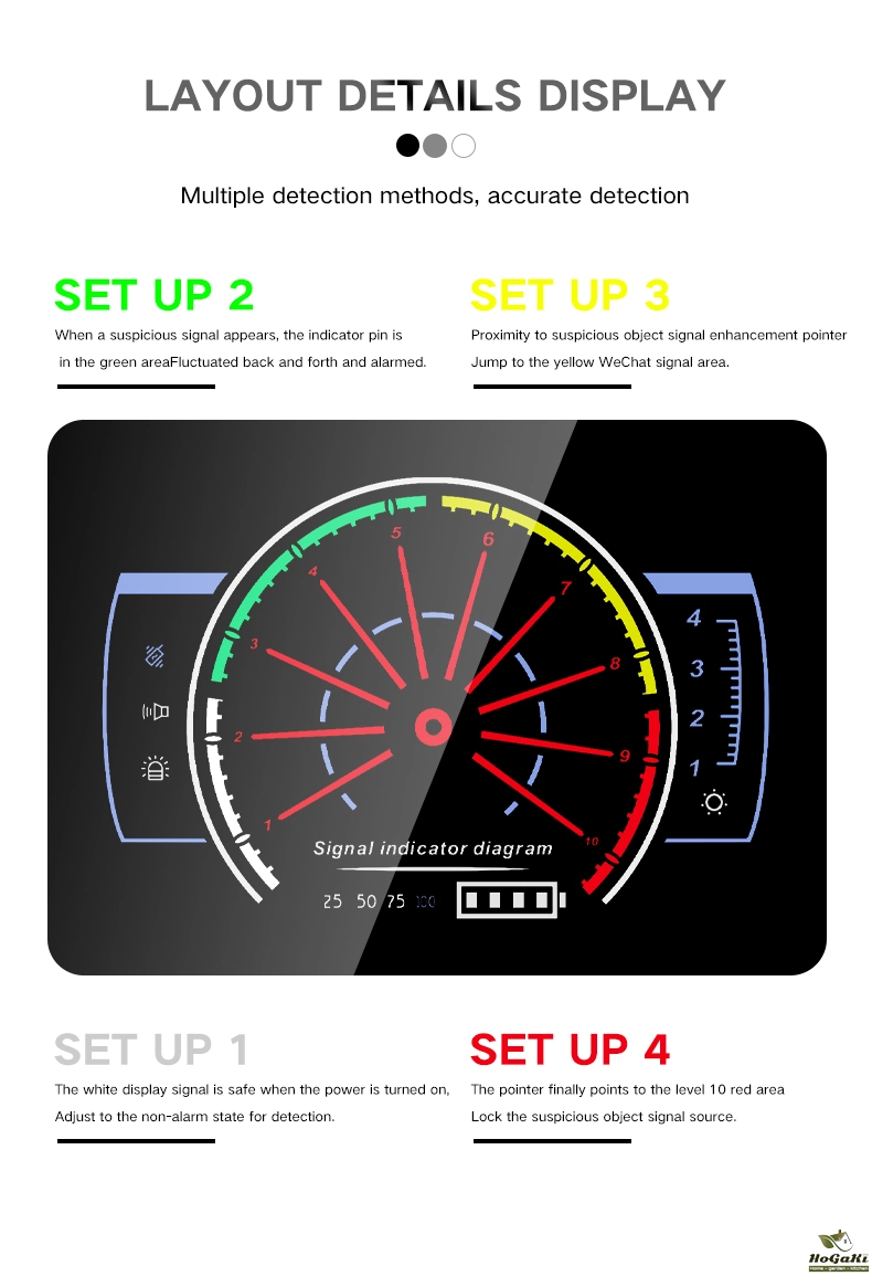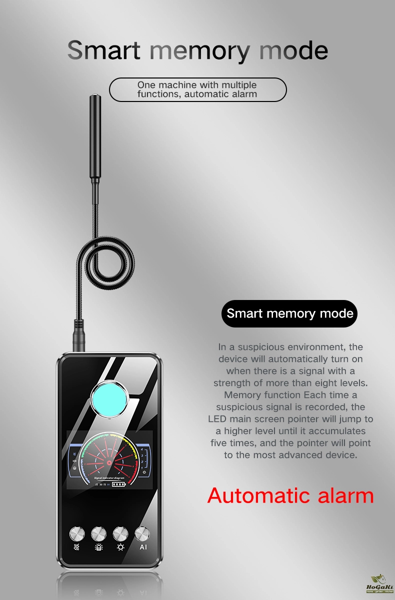 4. Light alarm: Intelligent memory mode: The device will automatically turn on when a signal with an intensity above level 8 appears in a suspicious environment. The memory function will automatically turn on the device every time a suspicious signal is recorded. The LED main screen pointer will jump to a higher level until it accumulates five times. The most advanced equipment will automatically alarm