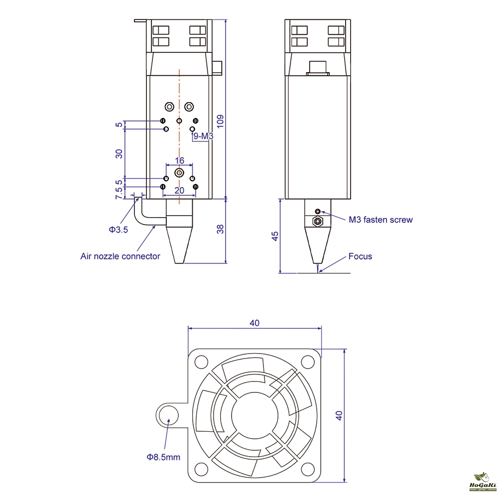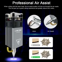 The laser head comes with a specially designed air assist nozzle. When cutting with this laser head, the air assit system will blow air through the air nozzle. That will bring you excellent cutting experience and greatly reduce burned marks.