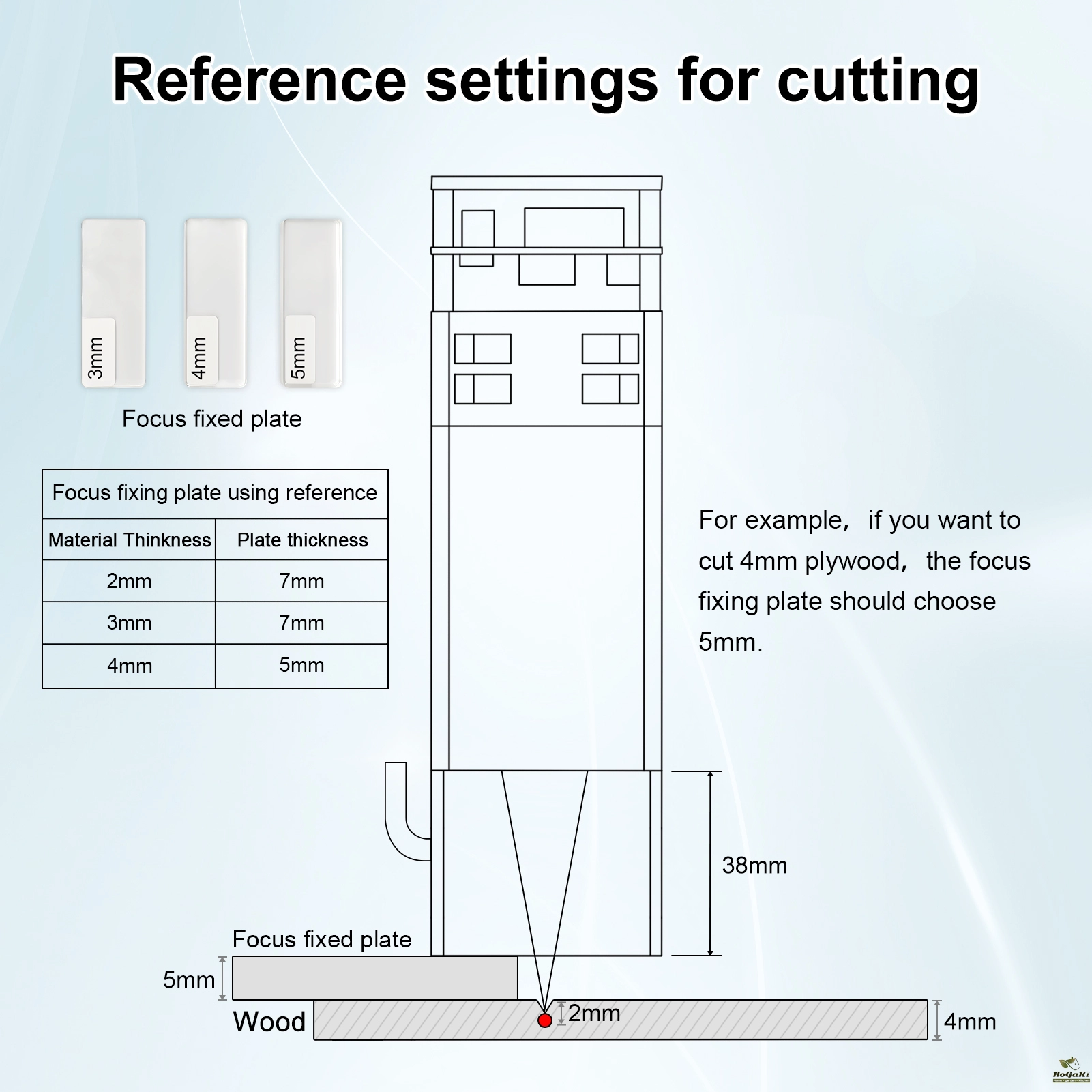 The ideal position of the focal point is in the middle of the material, the cutting focal point of LT-80W-AA is 45mm, the length of the air nozzle is 39mm, so the focal point position is 6mm below the air nozzle. For example, if you want to cut 8mm plywood, the distance from the air nozzle to the surface of the material should be 6mm-8mm/2=2mm.