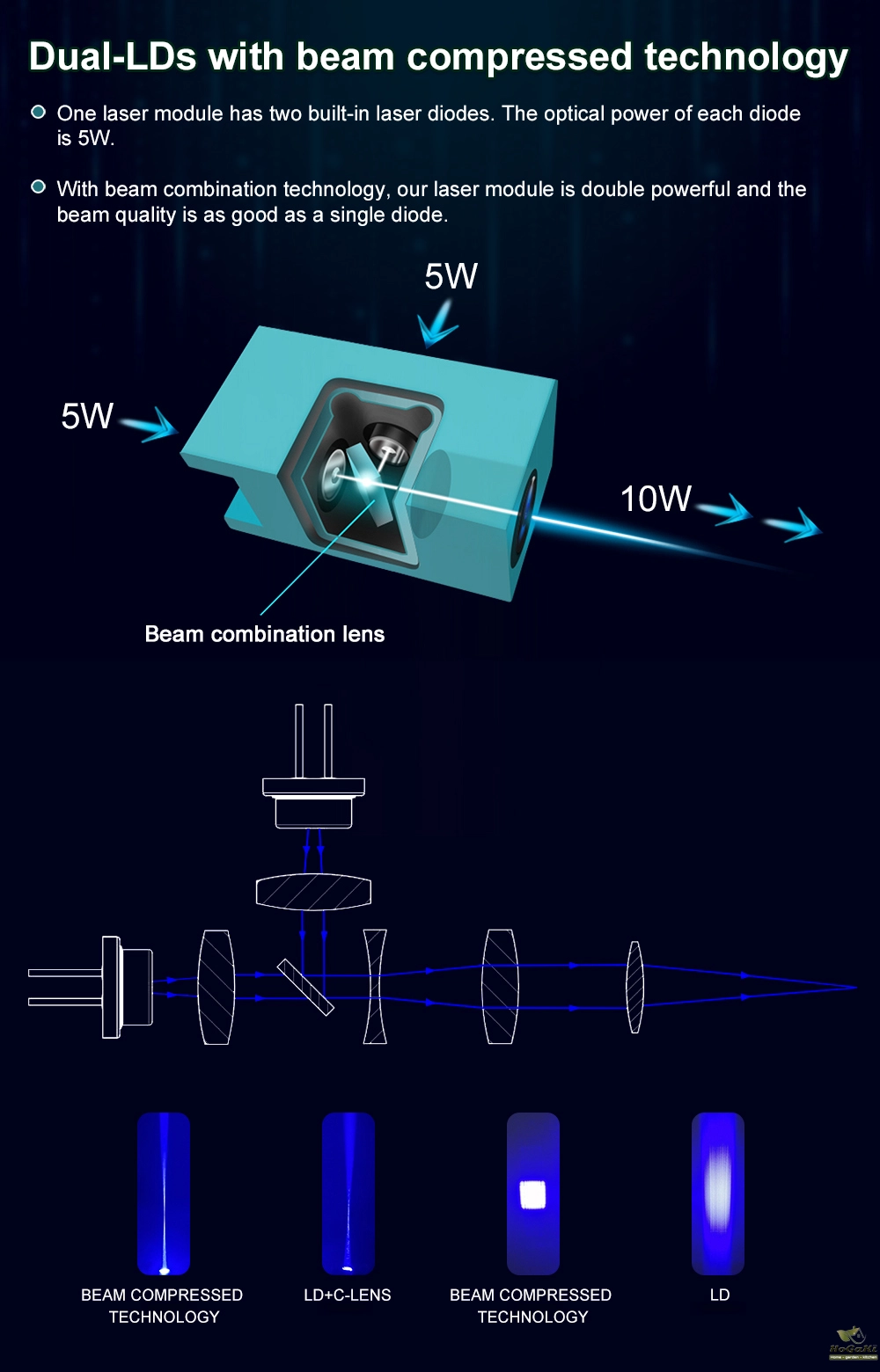 With beam combination technology, our laser module is double powerful and the beam quality is as good as a single diode.