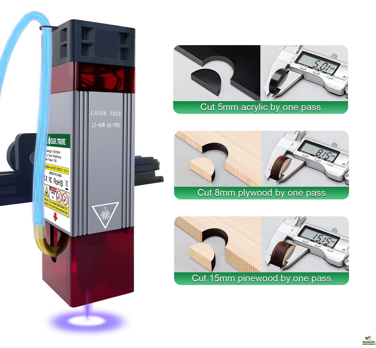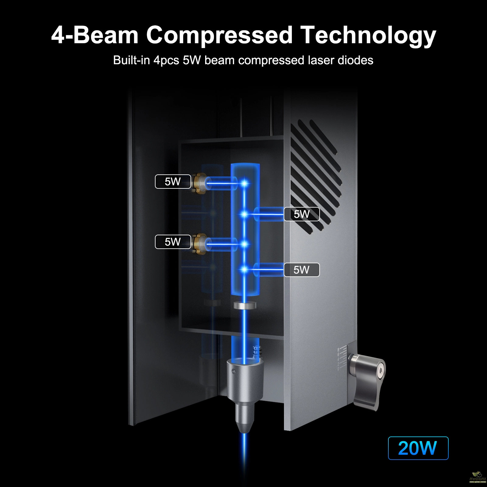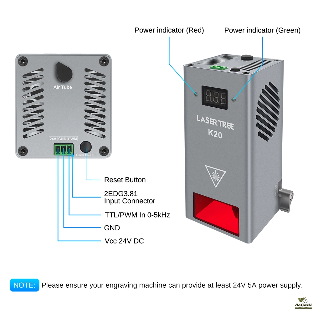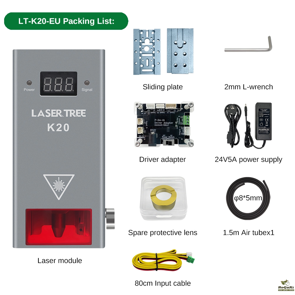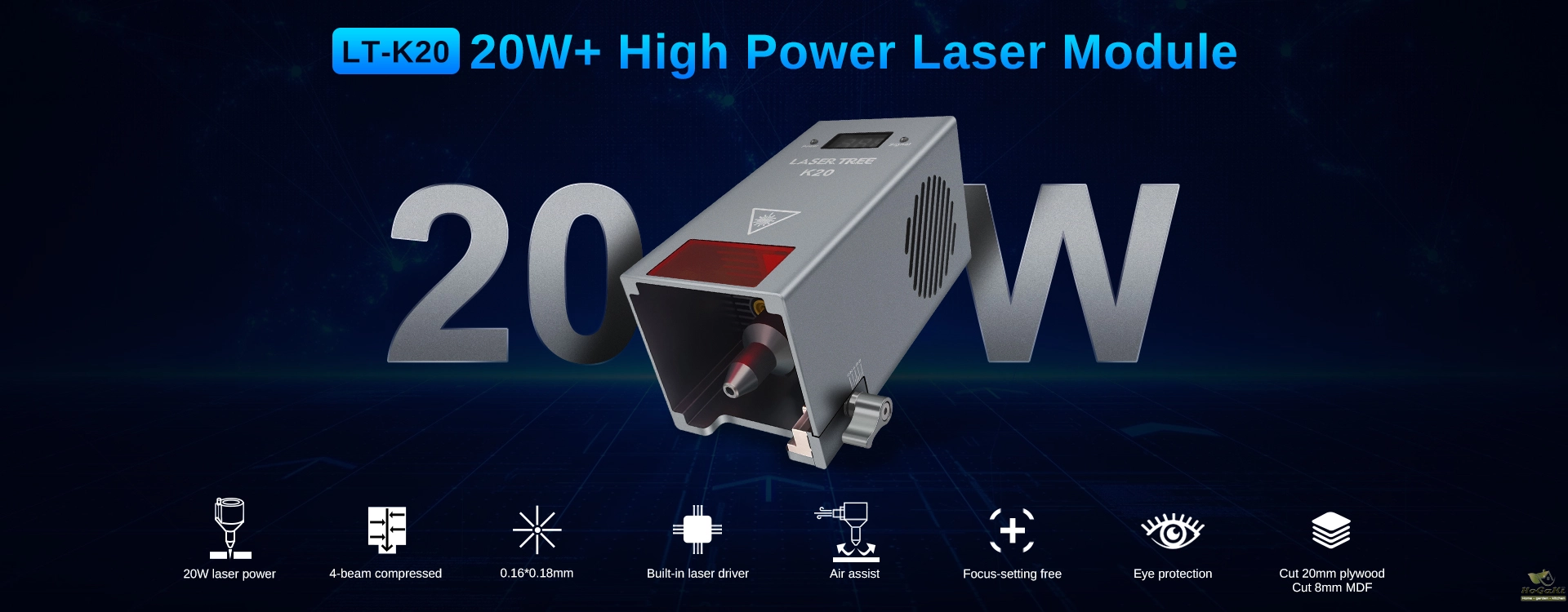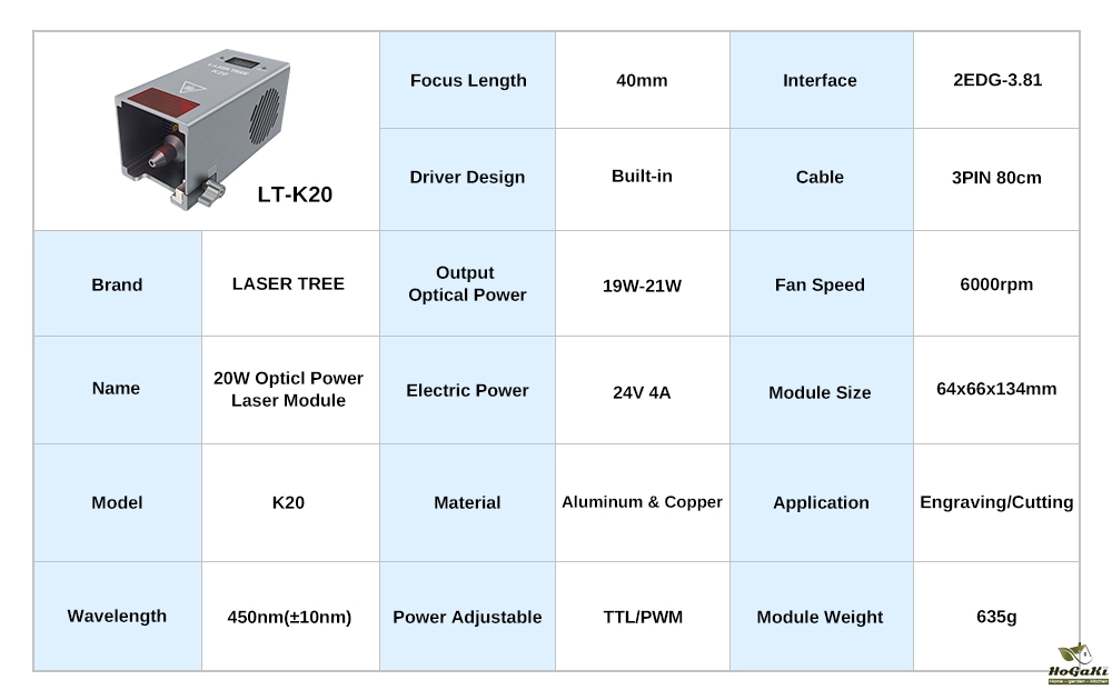 LaserTree K20 is a true 19-21W output optical power laser engraving and cutting module. It uses beam compressed technology to combine 4pcs 5W laser diodes into a powerful laser beam with 20W laser power.