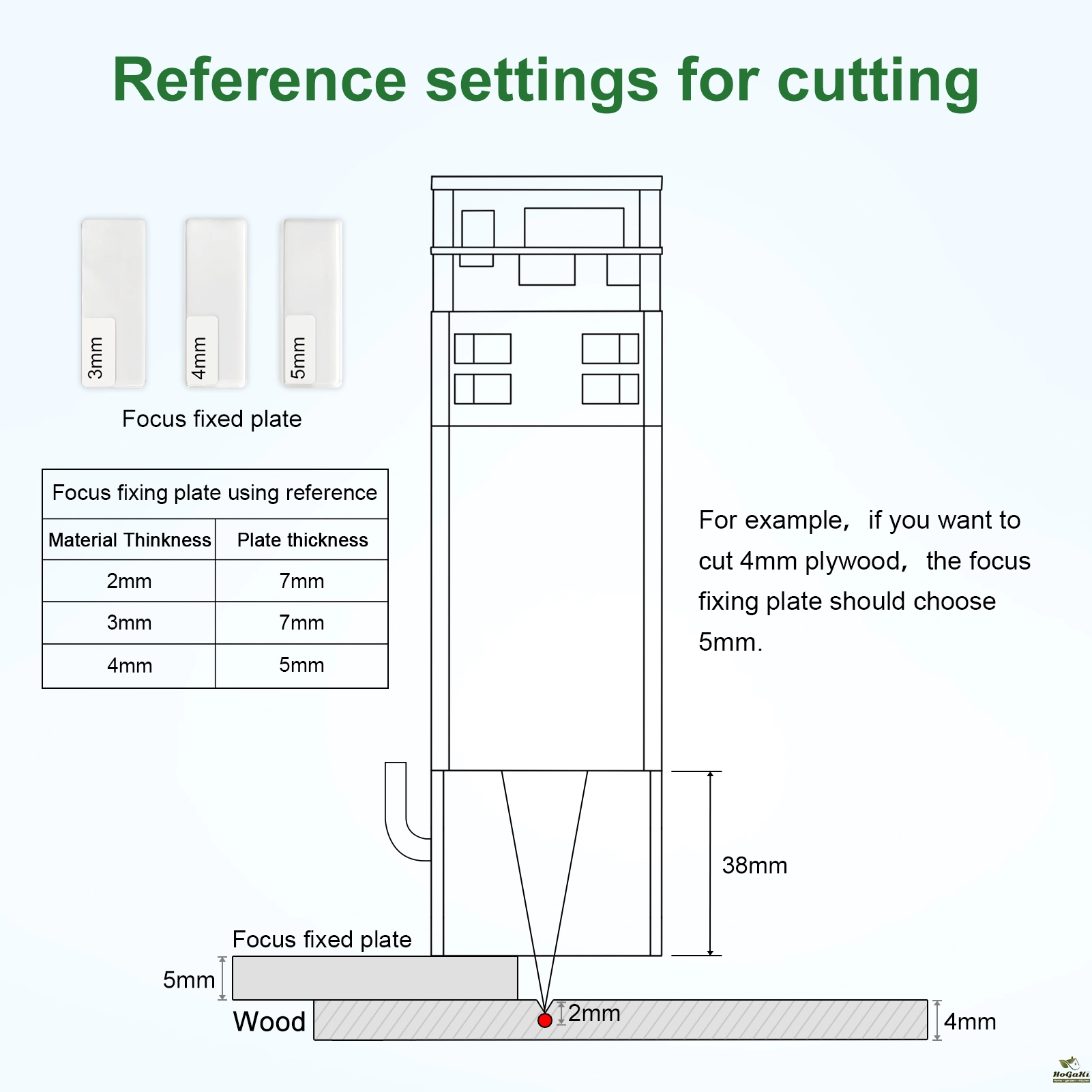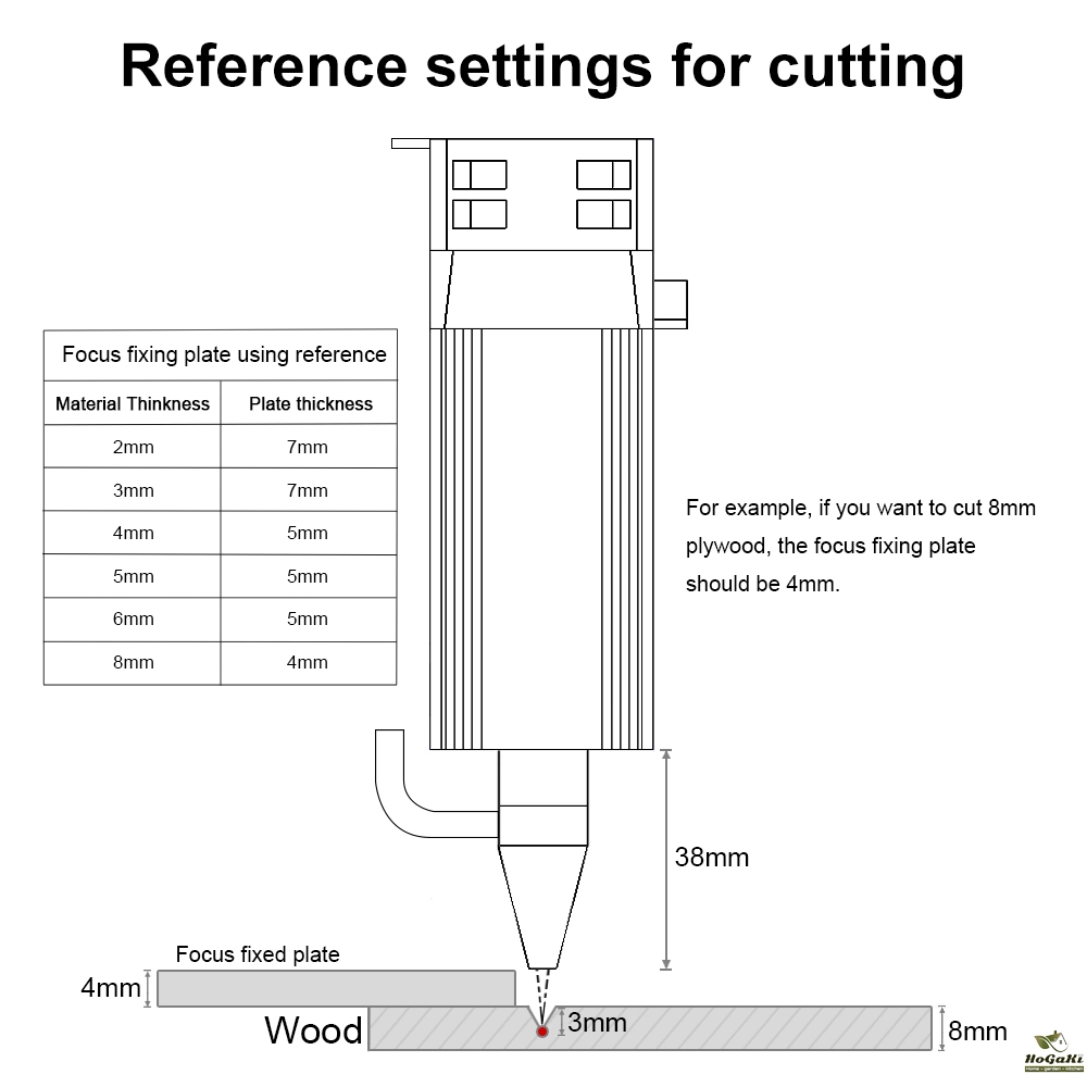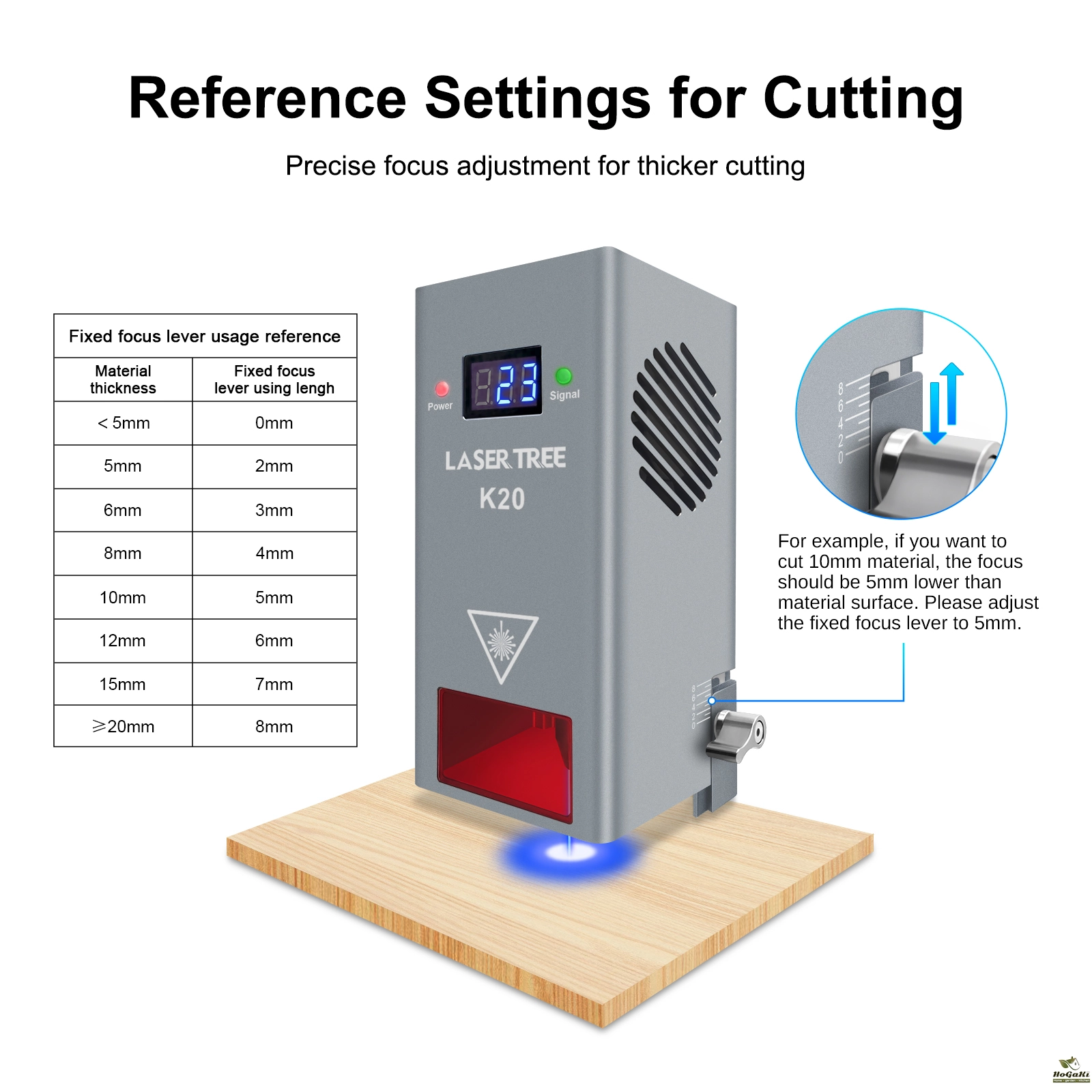 For example, if you want to cut 10mm material, the focus should be 5mm lower than material surface, please adjust the fixed focus lever to 5mm.
