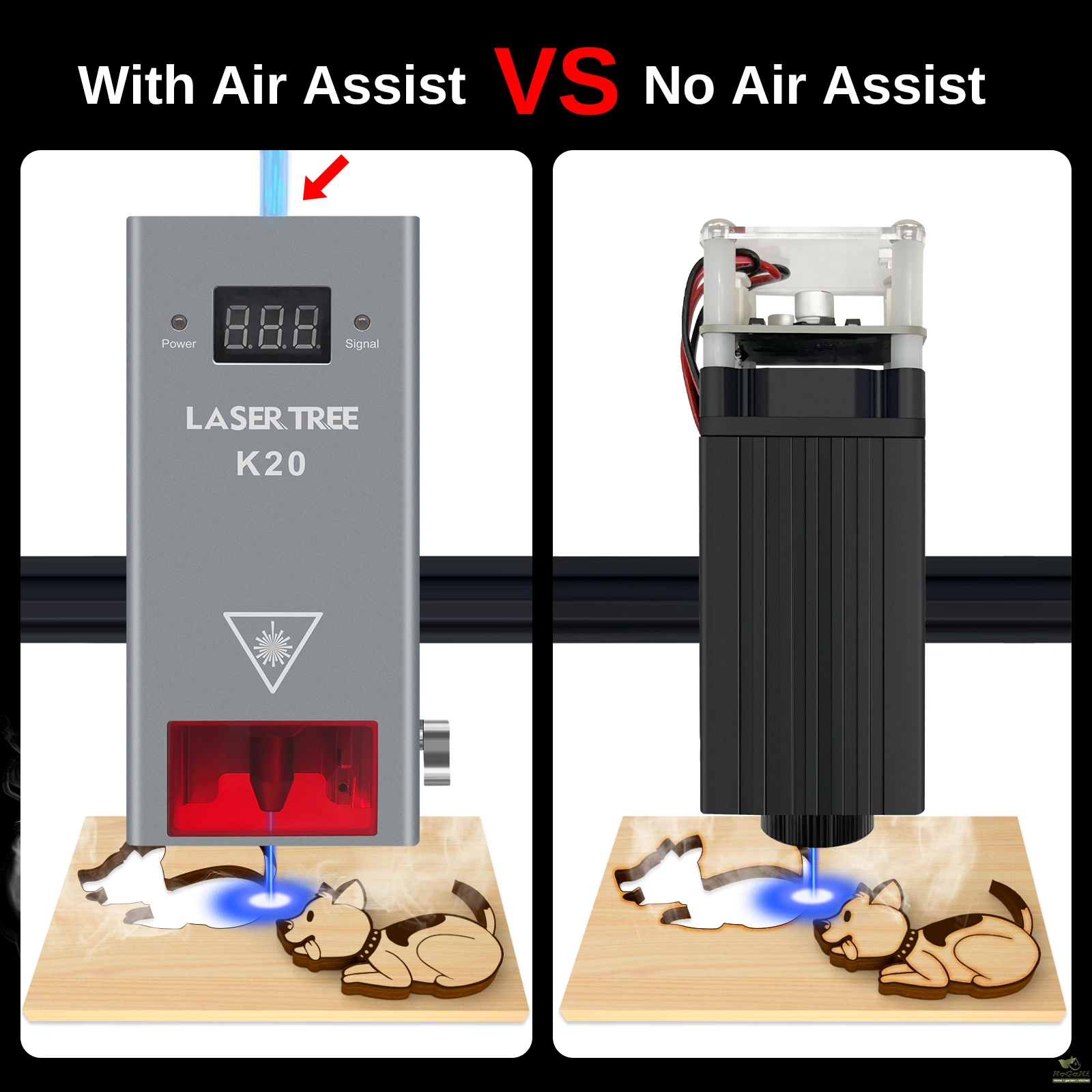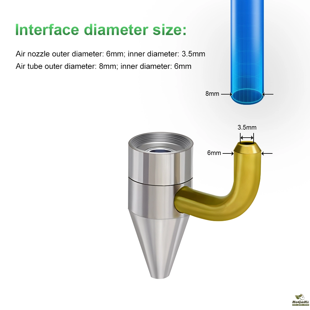 The laser head comes with a specially designed air assist nozzle. When cutting with this laser head, the air assit system will blow air through the air nozzle. That will bring you excellent cutting experience and greatly reduce burned marks.