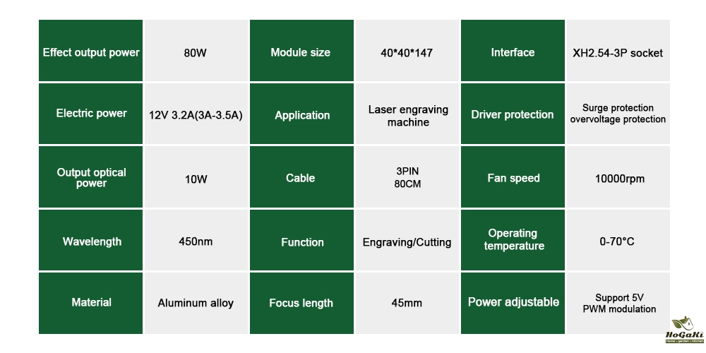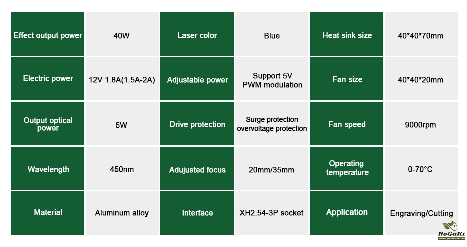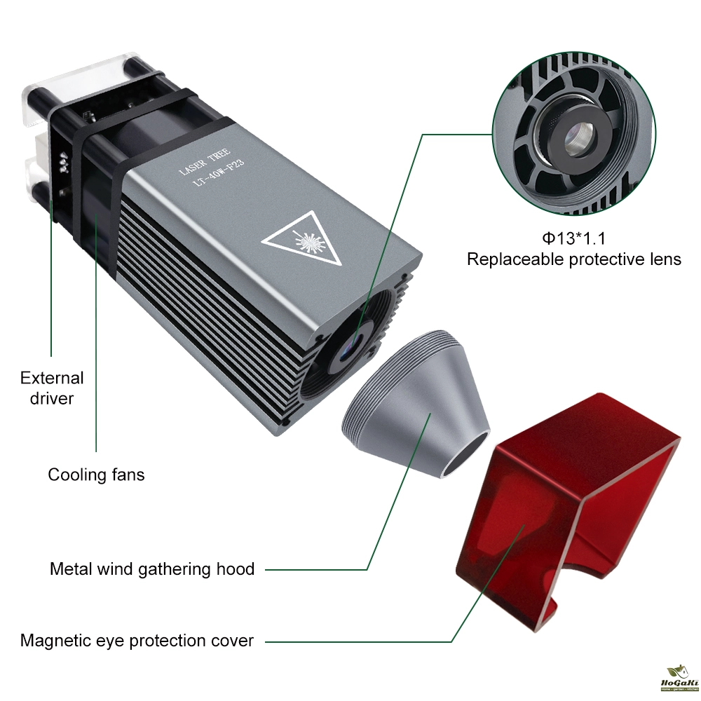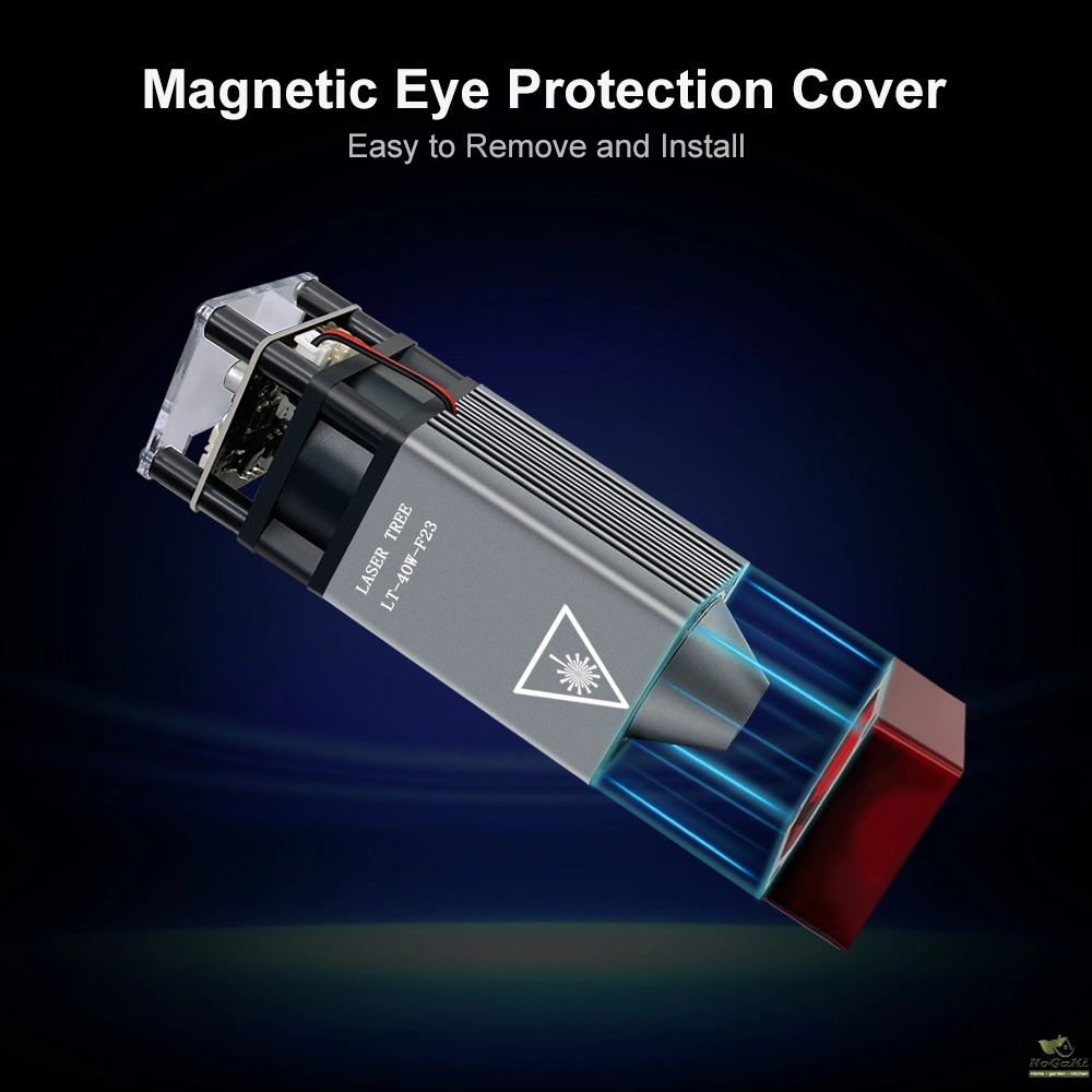 The 40W laser engraving head with metal wind gathering hood,prevent flames from burning. Upgraded Magnetic eye protective cover, easy to remove and install. Control line installation method: pluggable. suitable for DIY engraving and cutting machine.