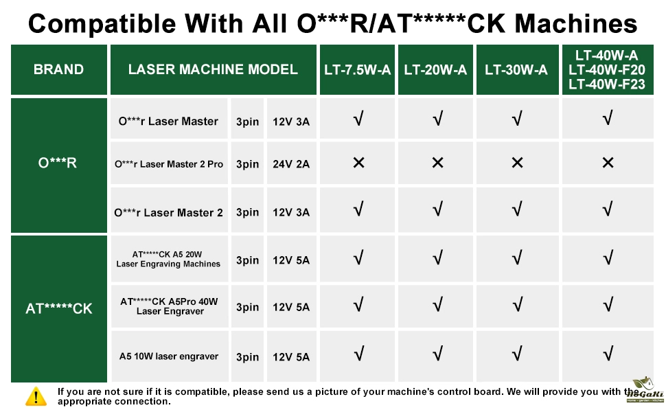 LT-80W-AA-Pro laser module can be installed on Z*aitu,O*tur,Tw* Trees,S*ulpful9, Xtool, A*omstack and other models of DIY laser engraving machines.