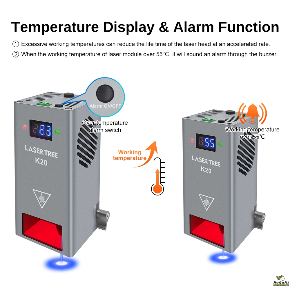 LaserTree K20 create a solution with working temperature display,so that you can check the internal temperature of the module easily. When the working temperature of laser module over 55 ℃, it will sound an alarm through the buzzer.
