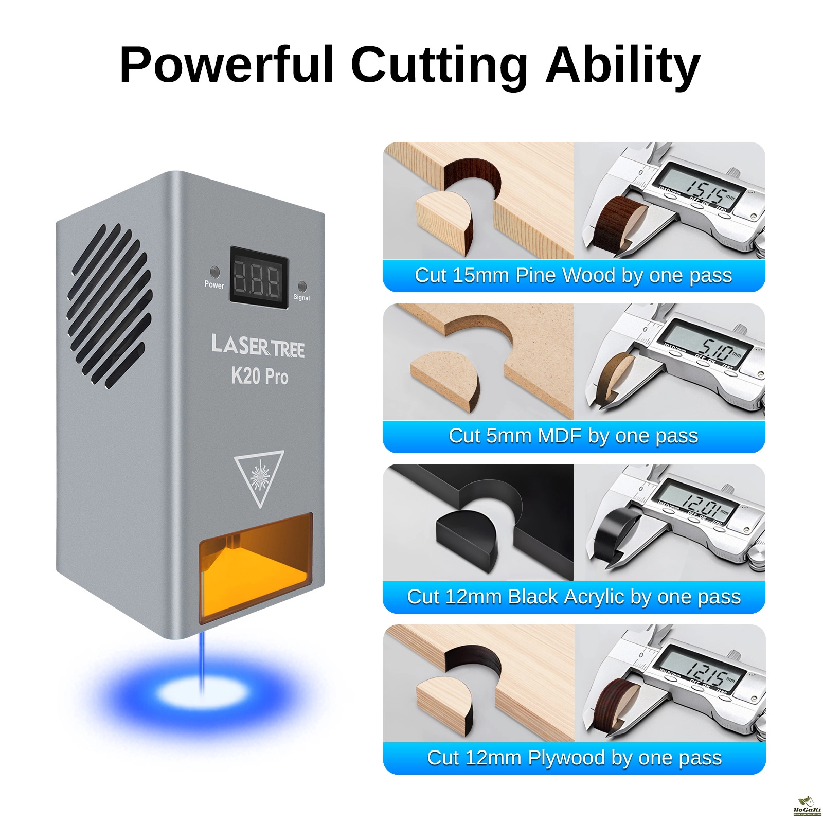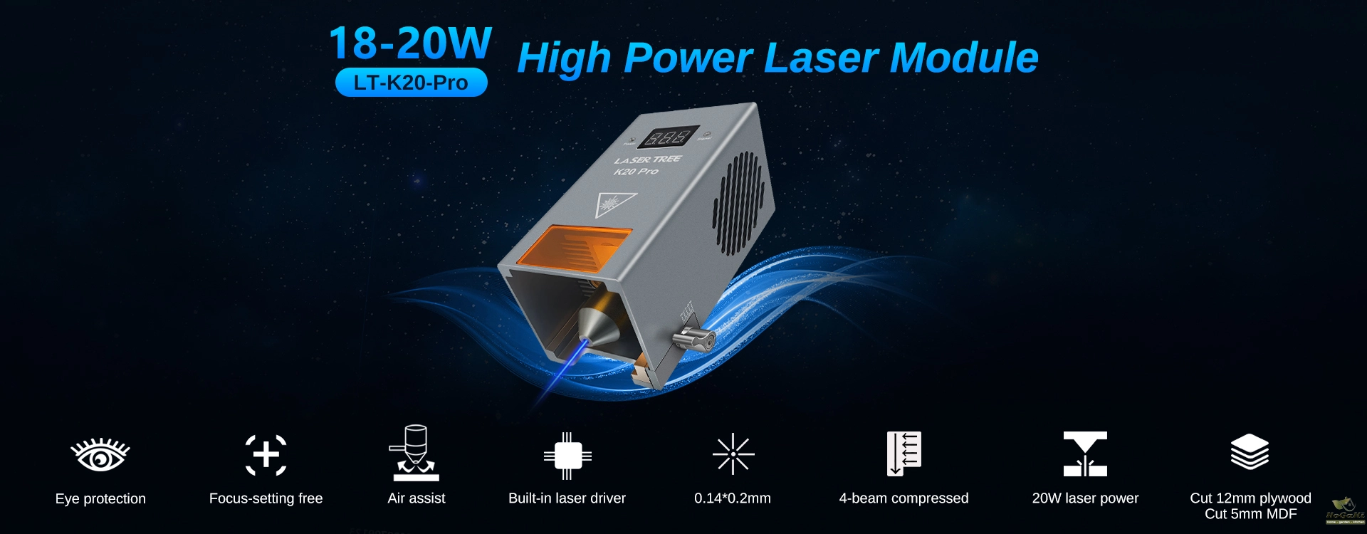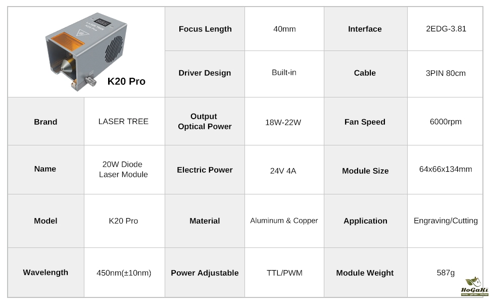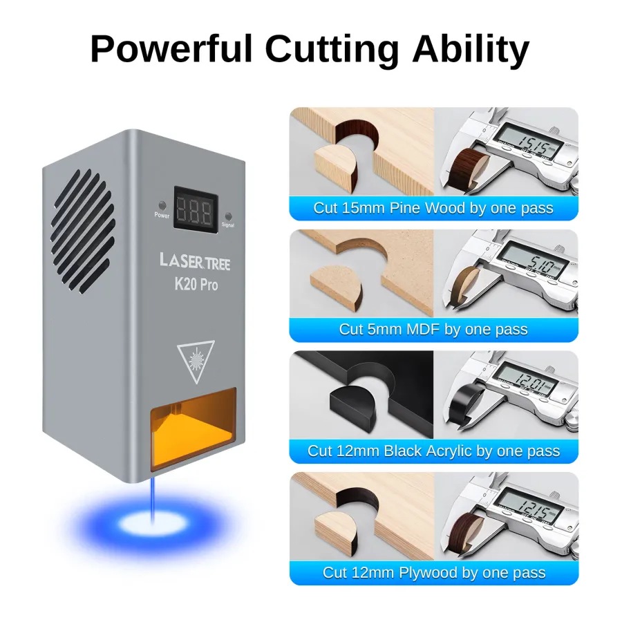 LaserTree K20-pro is a true 18-22W output optical power laser engraving and cutting module. It uses beam compressed technology to combine 4pcs 5W laser diodes into a powerful laser beam with 20W laser power.