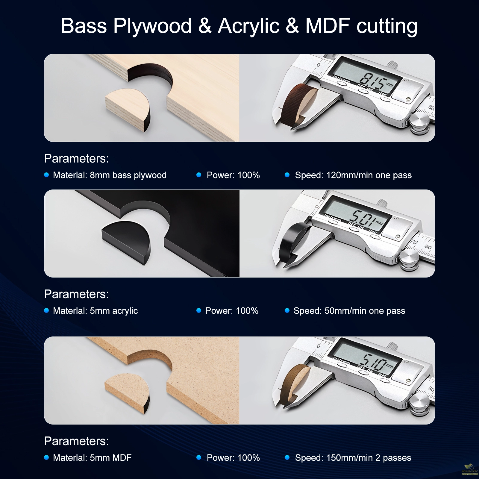 2. It can cut through 4mm plywood by one pass, the speed is 190mm/min, 100% power.