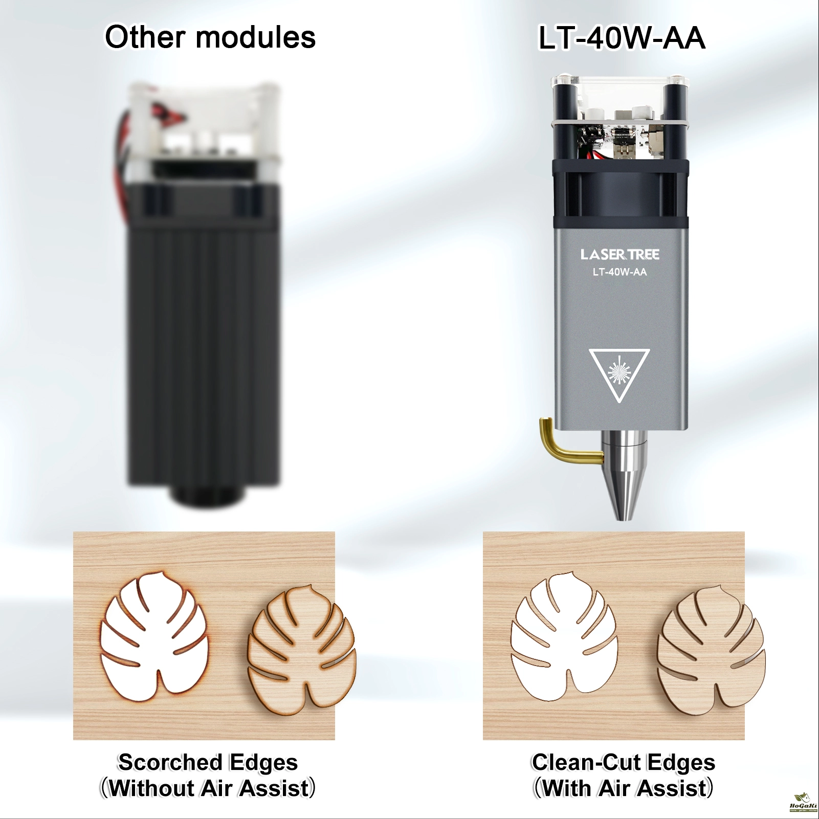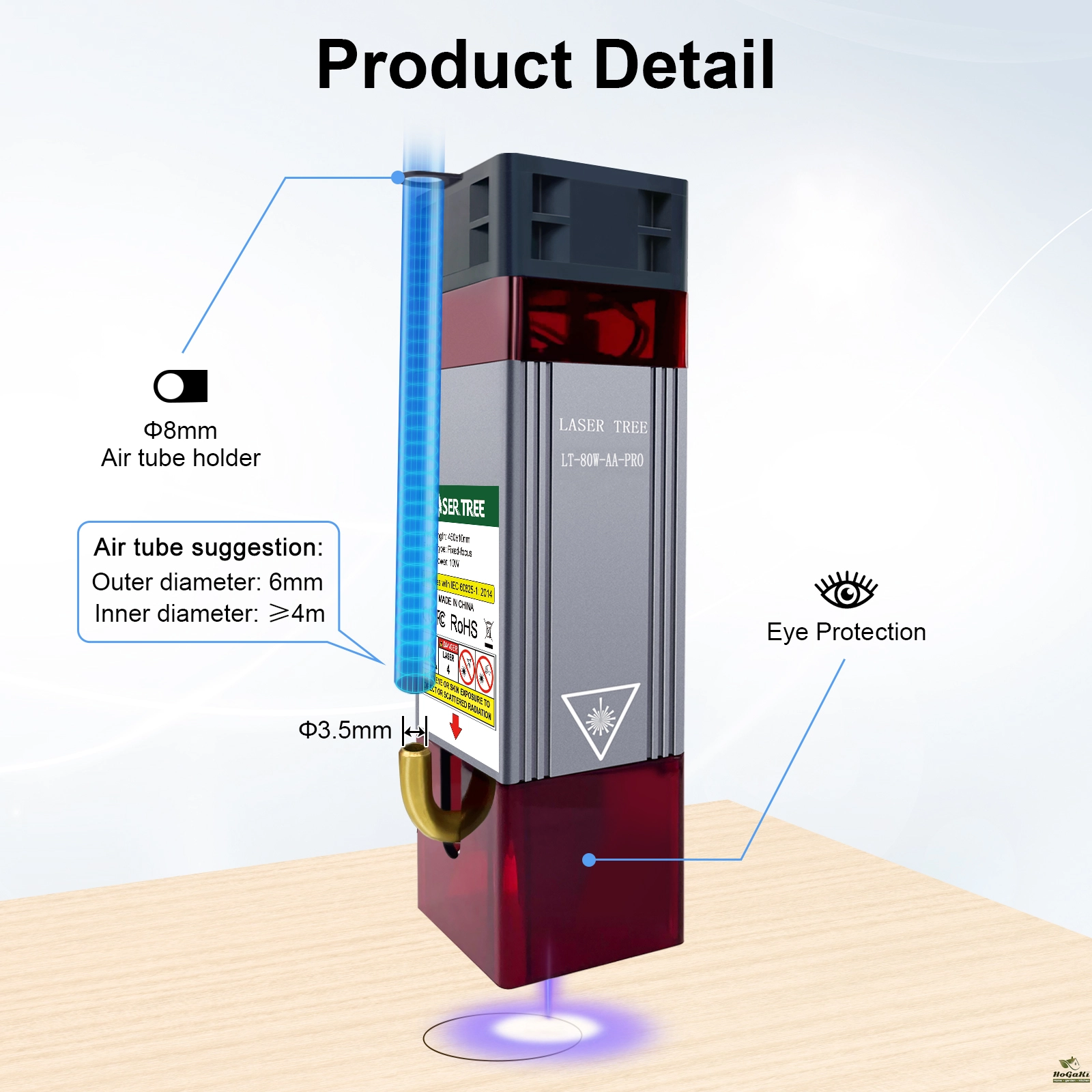 The laser head comes with a specially designed air assist nozzle. When cutting with this laser head, the air assit system will blow air through the air nozzle. That will bring you excellent cutting experience and greatly reduce burned marks.