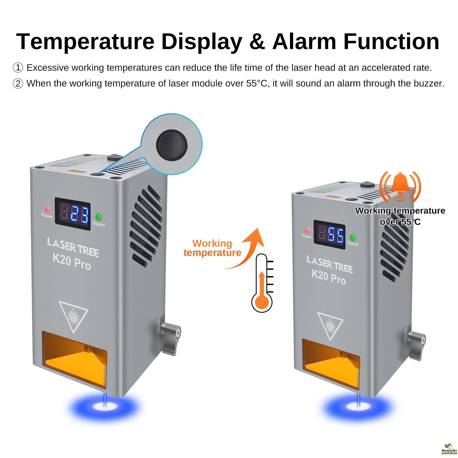 LaserTree K20 create a solution with working temperature display,so that you can check the internal temperature of the module easily. When the working temperature of laser module over 55 ℃, it will sound an alarm through the buzzer.