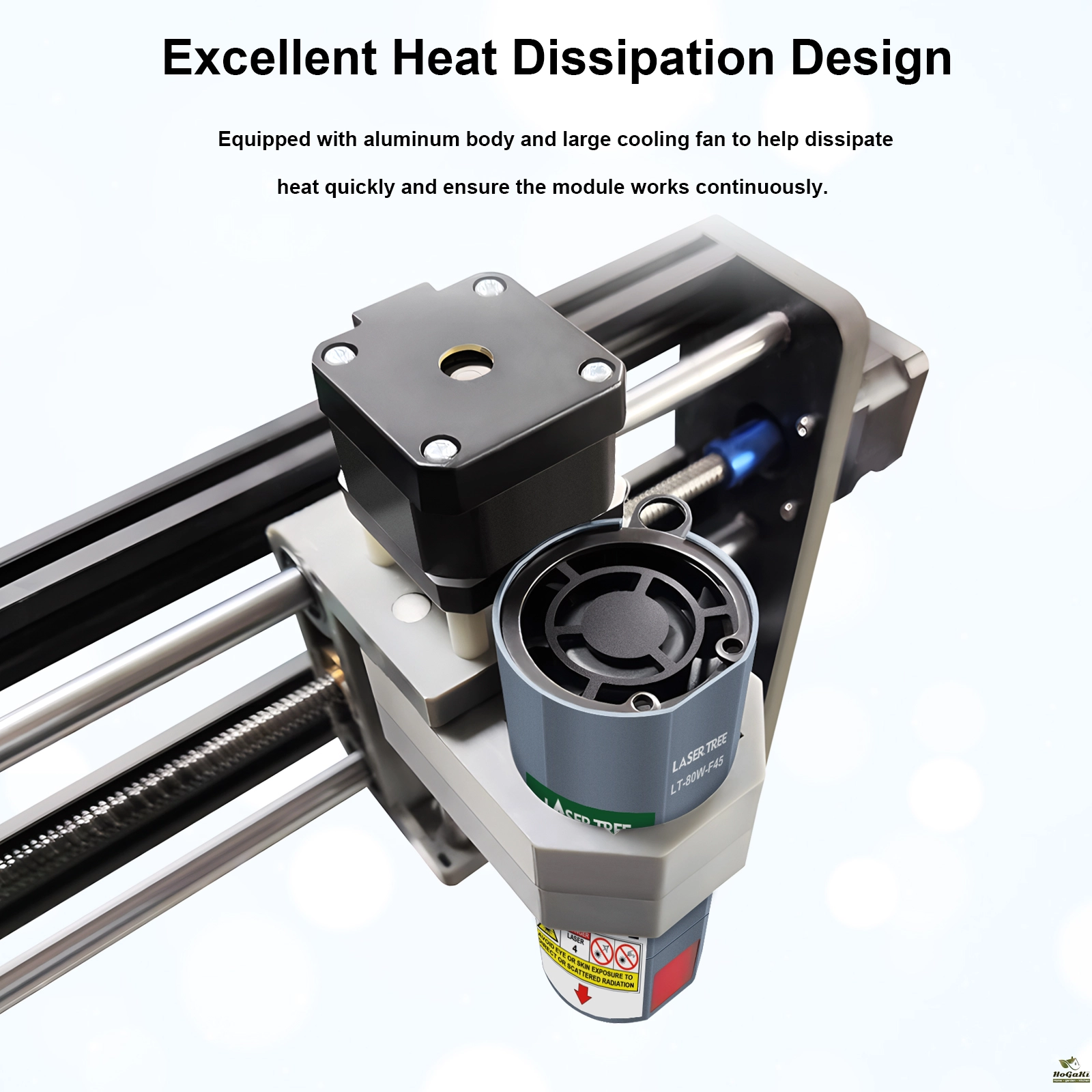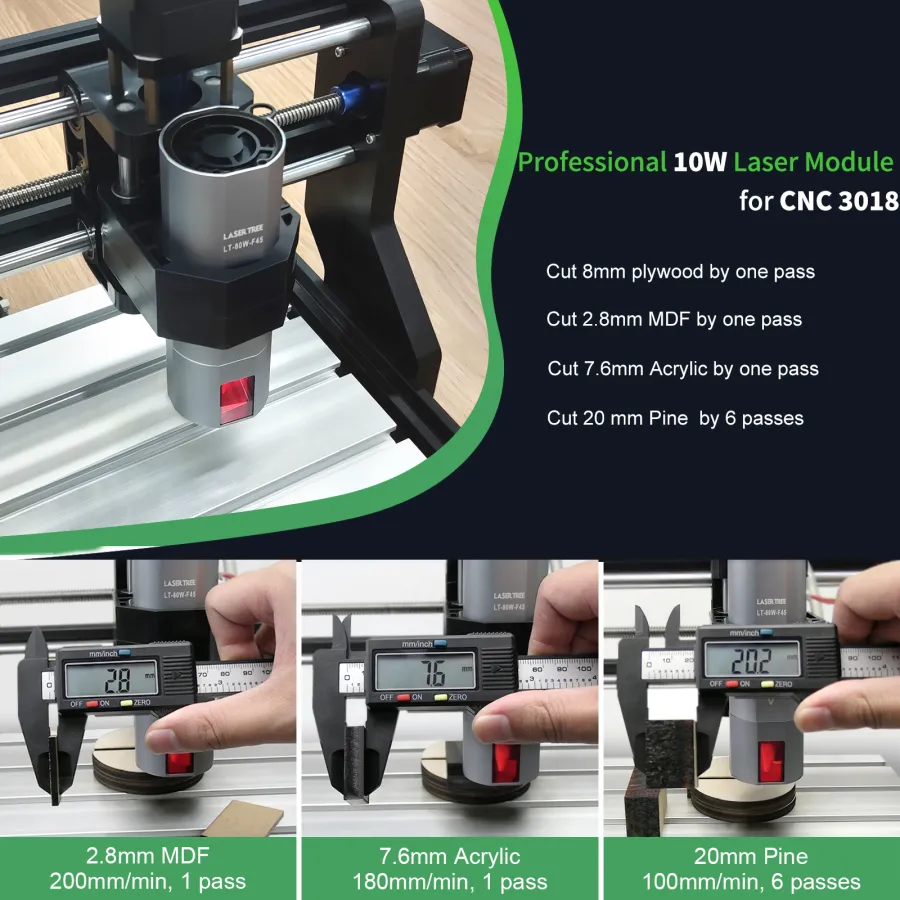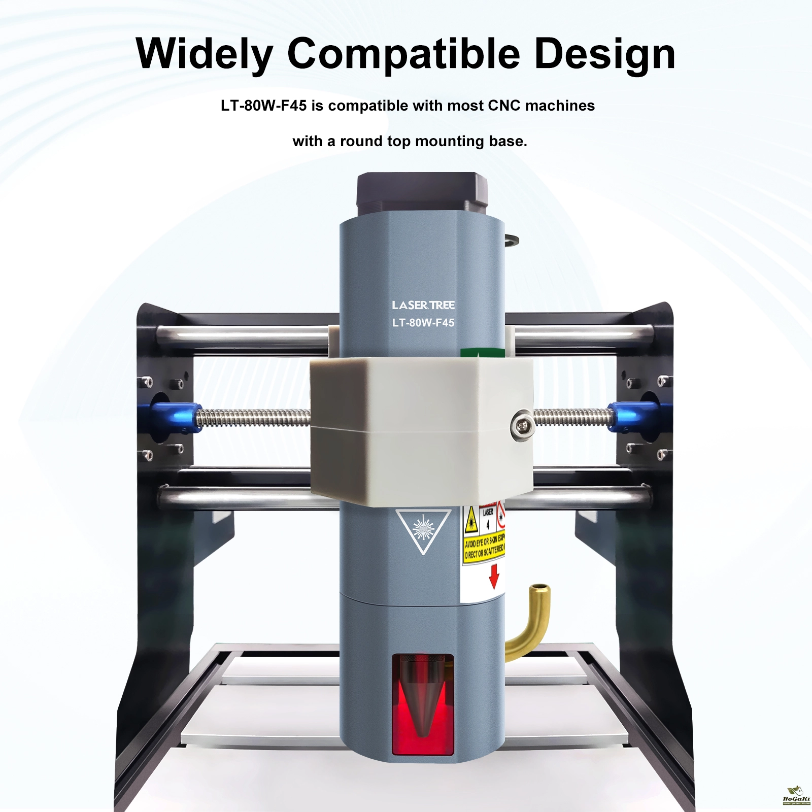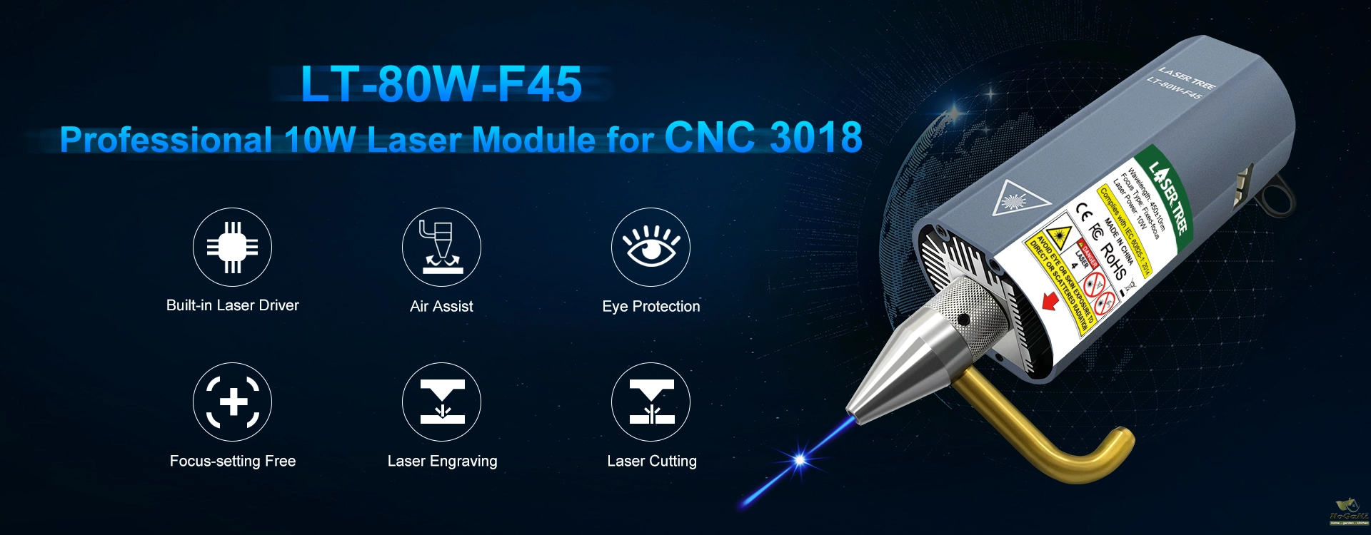 LT-80W-F45 is a laser engraving and cutting module specially designed for CNC 3018 machines. It is compatible with most CNC machines with a round top mounting base. For example, 3-axis CNC engraving machine (1610 pro/3018/3018 pro/3018 Max/4540/3020 Plus engraving machine, etc.)