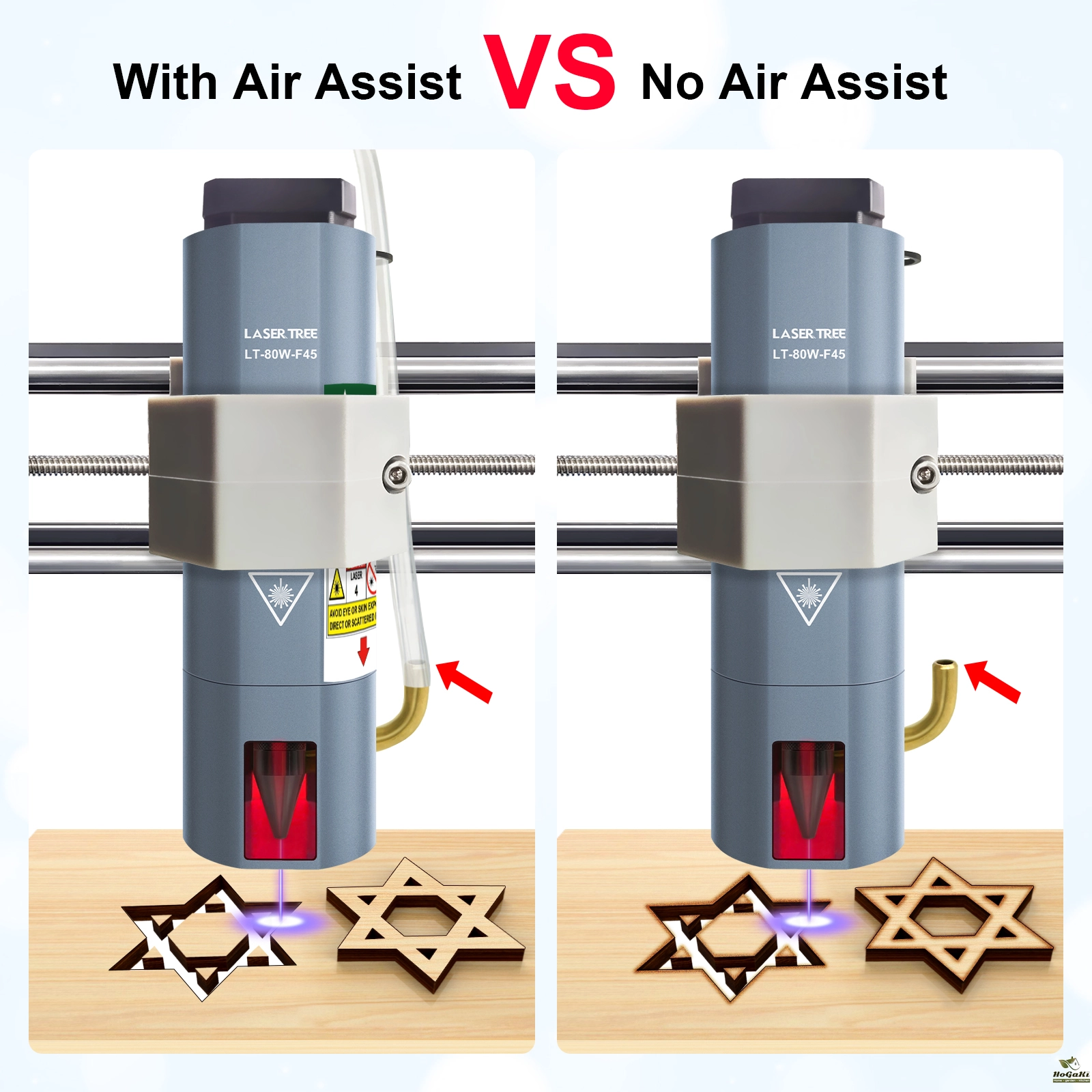 When performing laser cutting jobs, an air assist system blows air through the air nozzle, enhancing the cutting performance and reducing the burn marks.