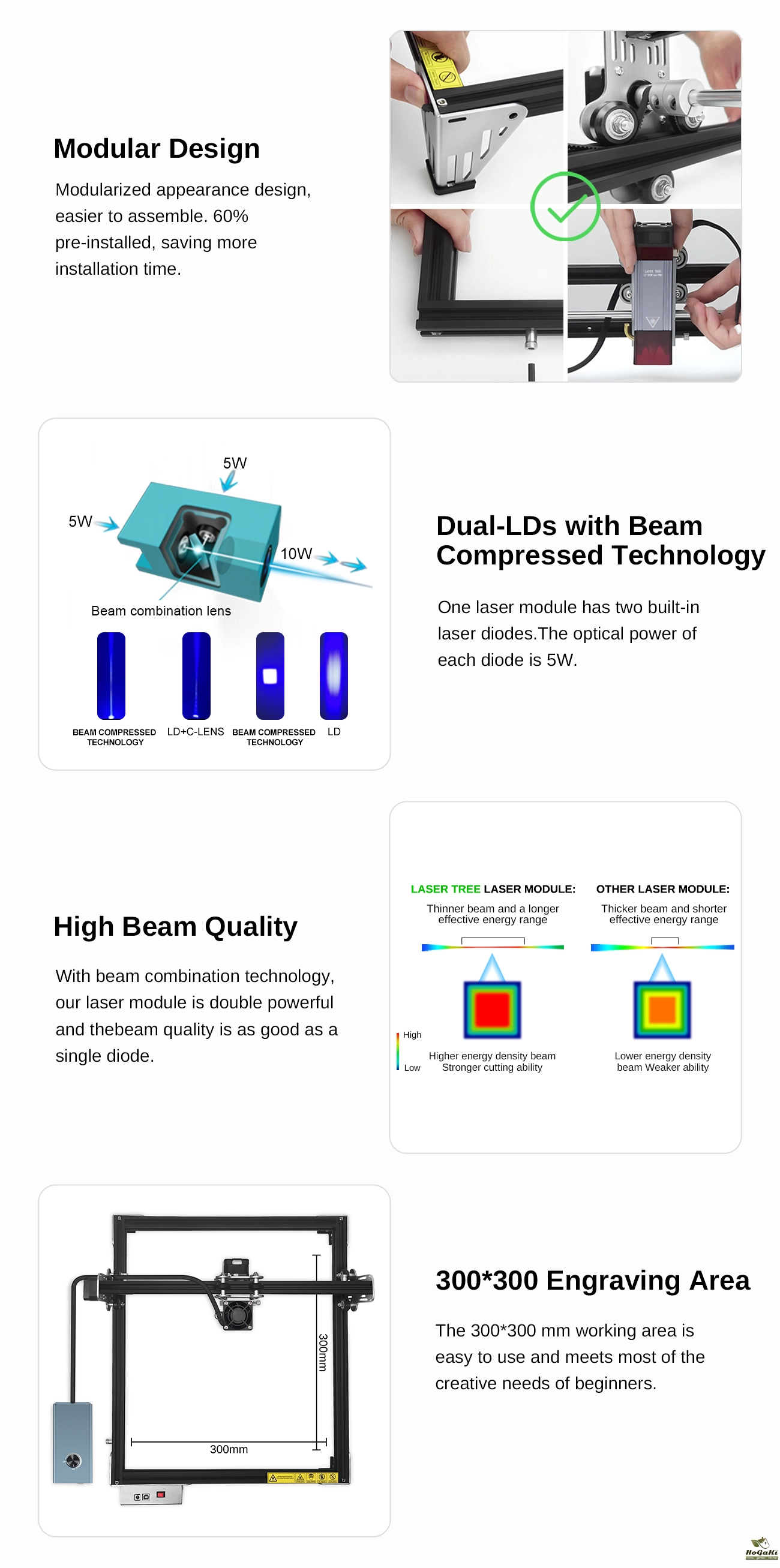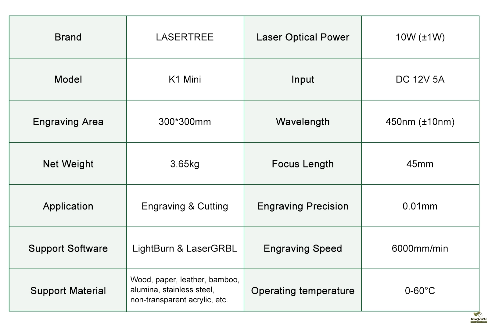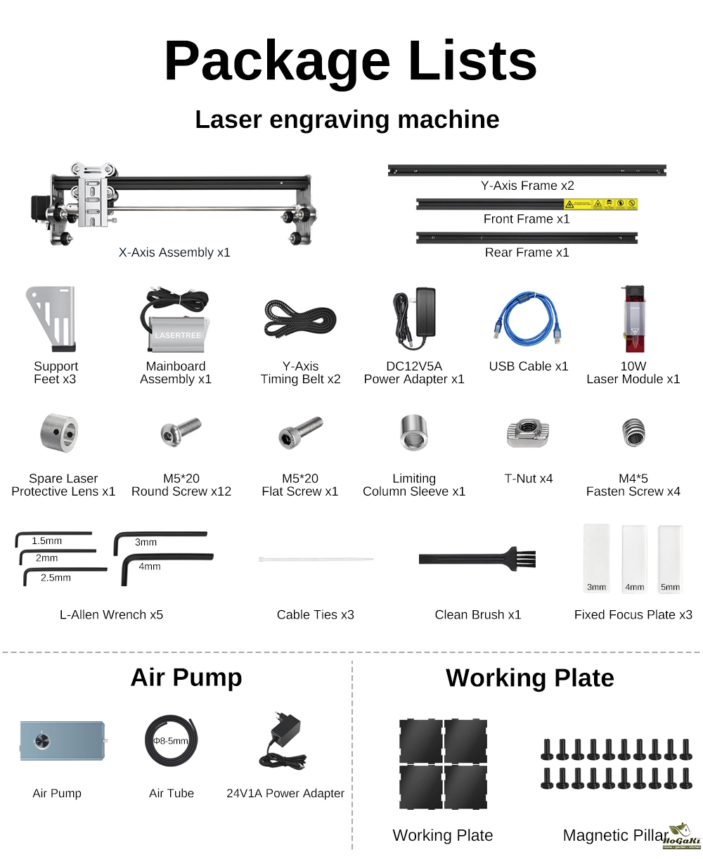 Laser Tree K1 Mini offers you a full set of accessories - laser engraving machine + 10W laser head + air pump + work plate.