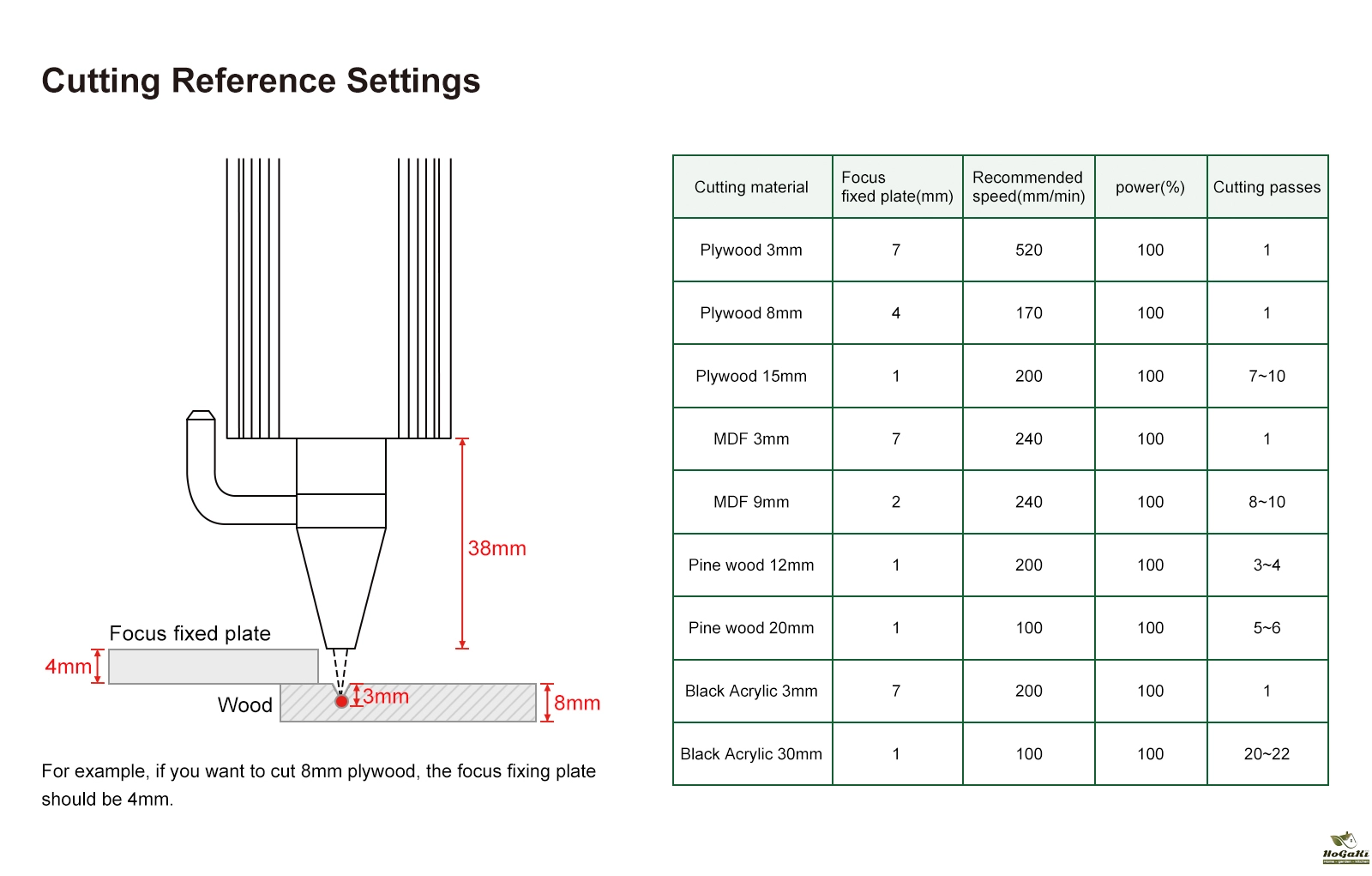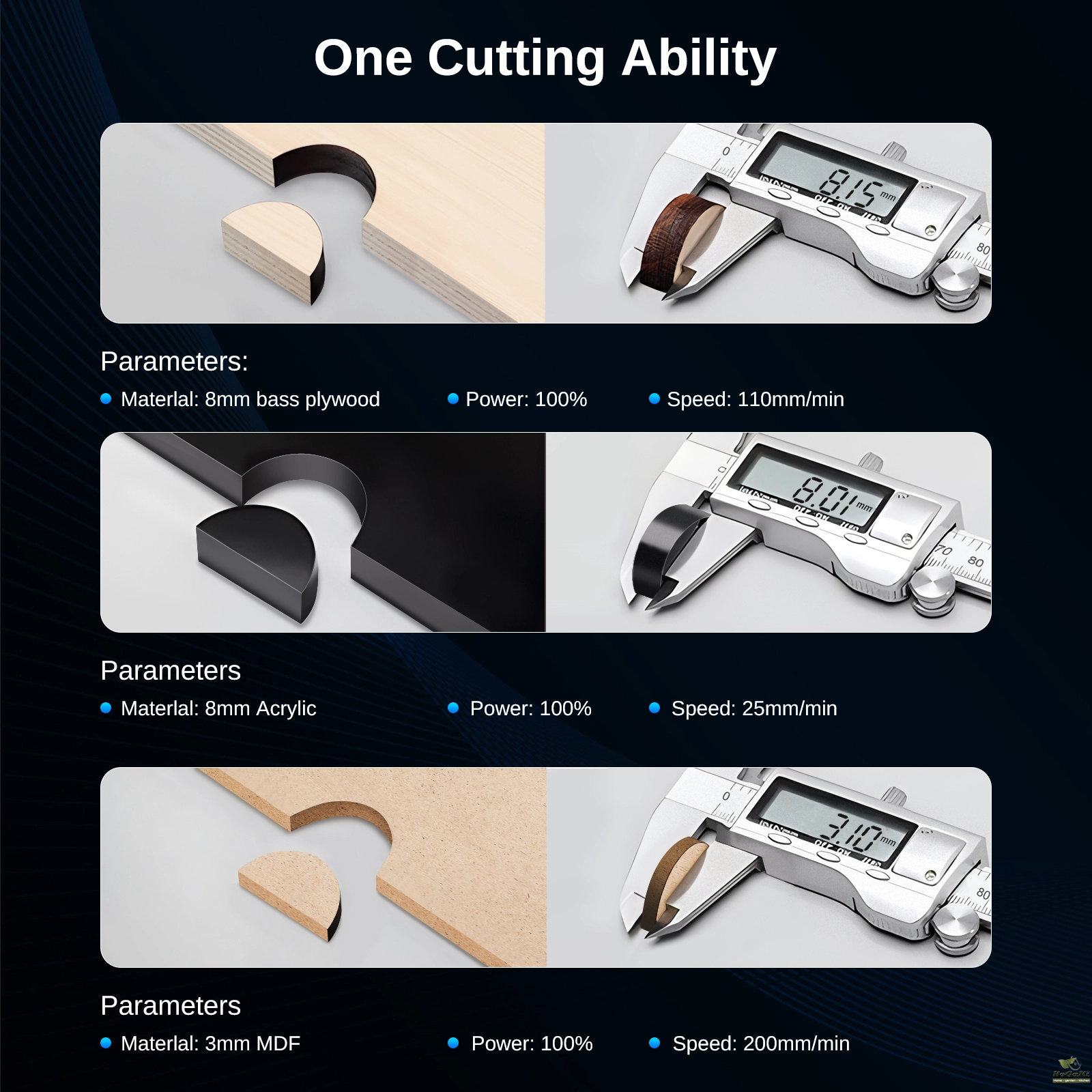 The laser head can cut through 8mm plywood, 8mm black acrylic, 3mm MDF by one pass. It is also equipped with a specially designed air assist nozzle. When cutting with this laser head, the air assit system will blow air through the air nozzle. That will bring you excellent cutting experience and greatly reduce burned marks.