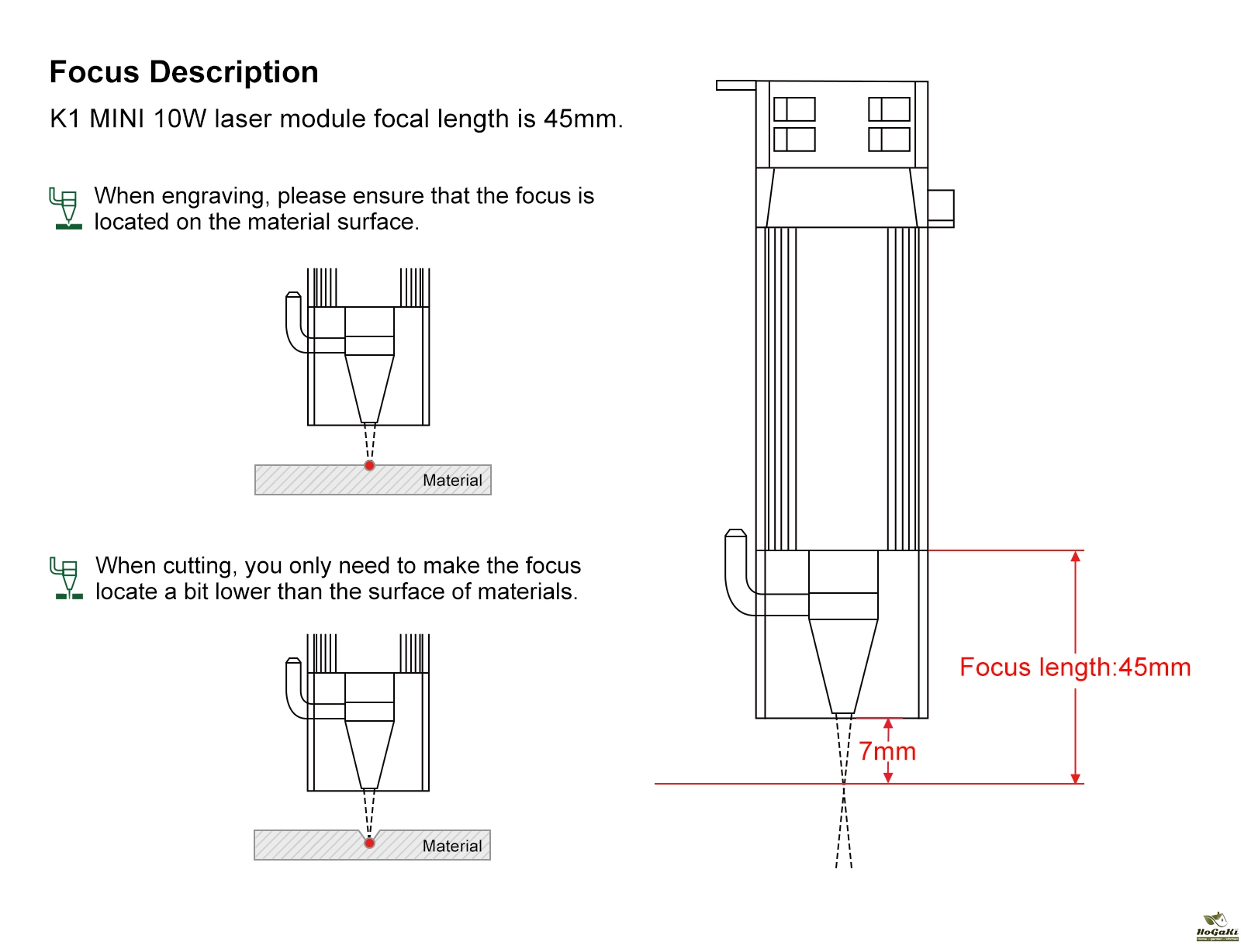 The ideal position of the focal point is in the middle of the material, the cutting focal point of LT-80W-AA is 45mm, the length of the air nozzle is 39mm, so the focal point position is 6mm below the air nozzle. For example, if you want to cut 8mm plywood, the distance from the air nozzle to the surface of the material should be 6mm-8mm/2=2mm.