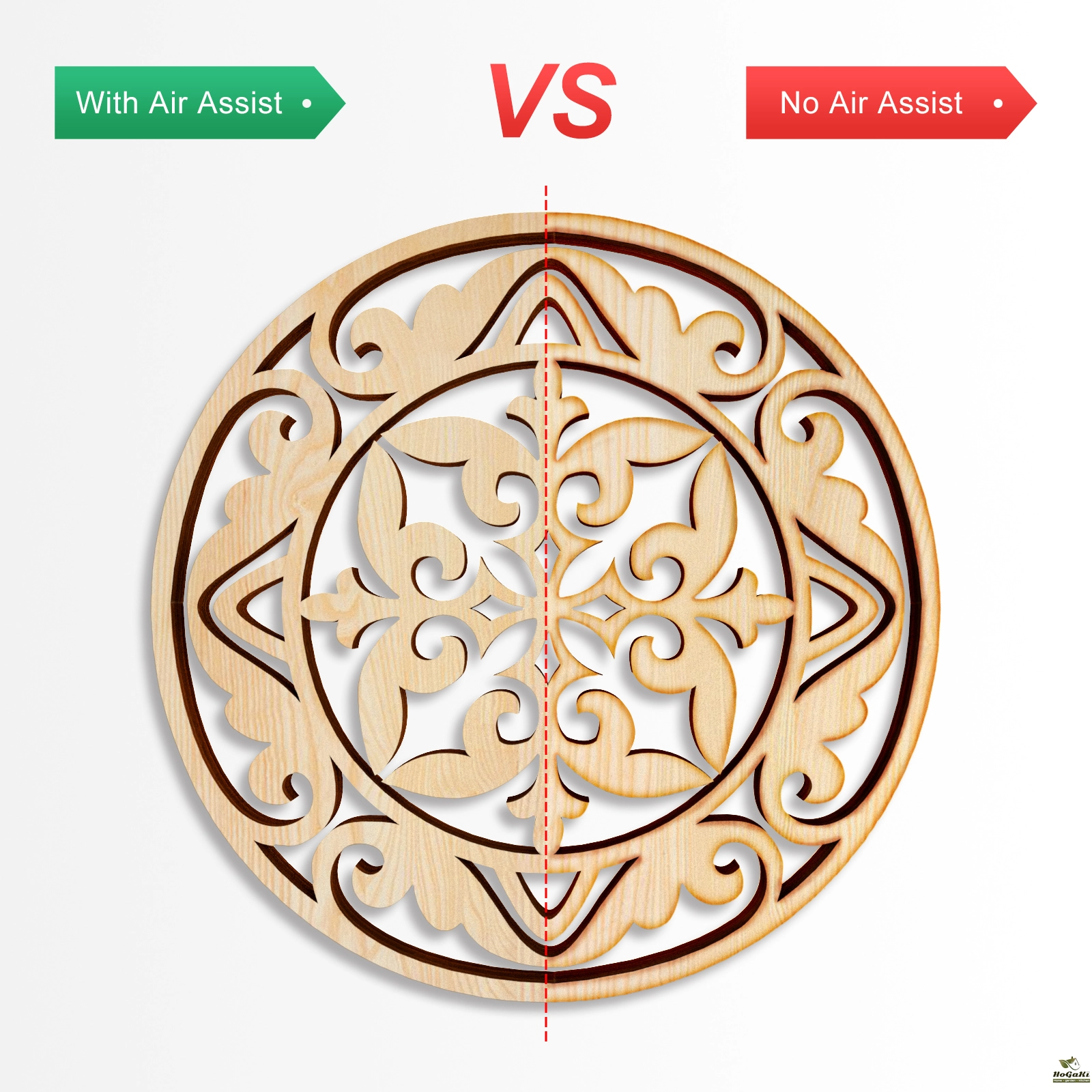 When cutting with this laser head, the air assit system will blow air through the air nozzle. That will bring you excellent cutting experience and greatly reduce burned marks.