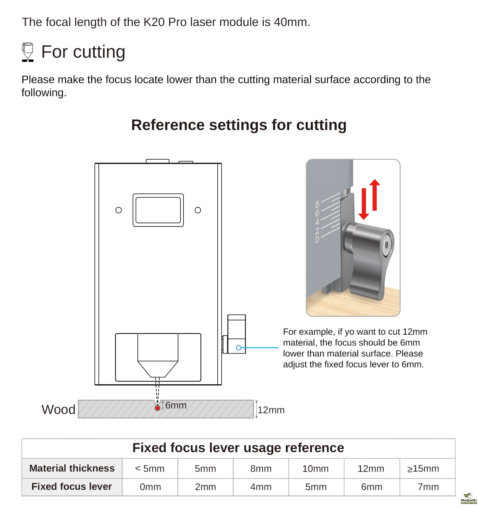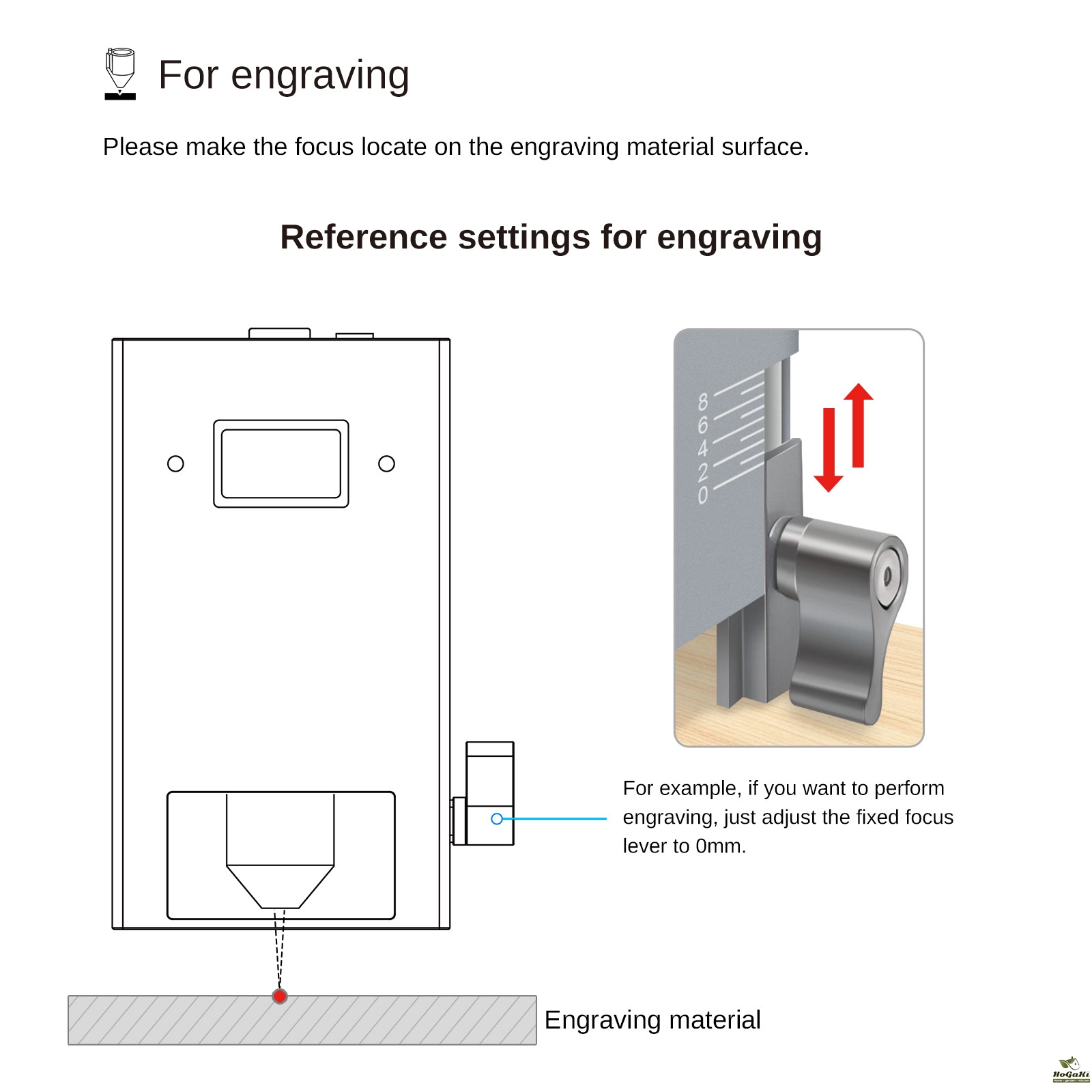 For example, if you want to cut 10mm material, the focus should be 5mm lower than material surface, please adjust the fixed focus lever to 5mm.