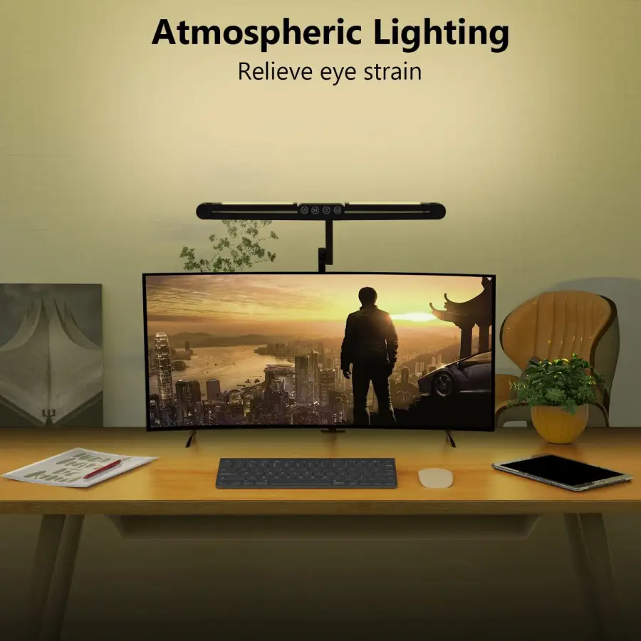When the bilateral auxiliary lights shine upwards, they can work as ambient lights to relieve eye strain. The built in light sensor will automatically adjust the brightness accordingly to a comfortable level depending on the surrounding light. The main light and the auxiliary lights of the office lamp need to be turned on or off separately, but the brightness and color temperatures are controlled together.