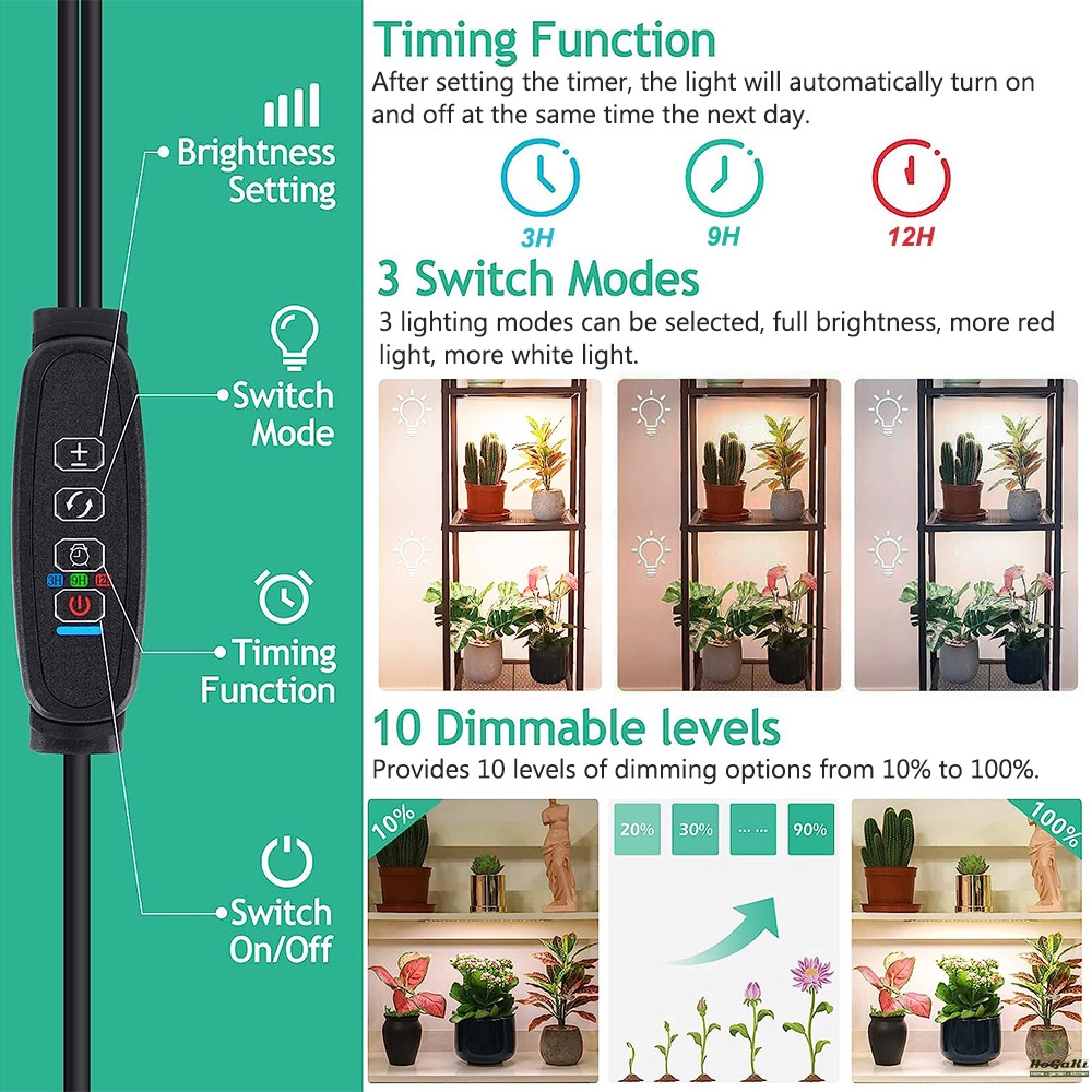10 Dimmable Options & 3 Lighting Modes: The grow light has 10 levels of brightness, which not only saves electricity but also ensures the right light intensity for your plants. They also feature 3 lighting modes: full, more white light, or more red light, giving your plants the light they need to grow, giving them better care!