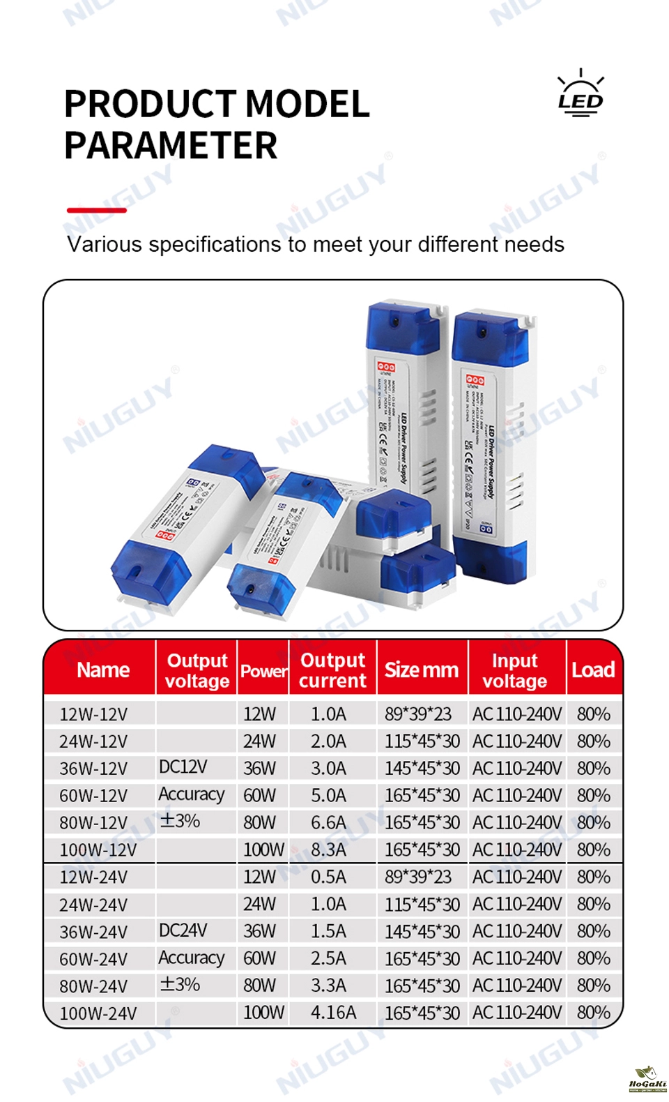 1. Power: 12W / 24W / 36W / 60W / 80W/ 100W