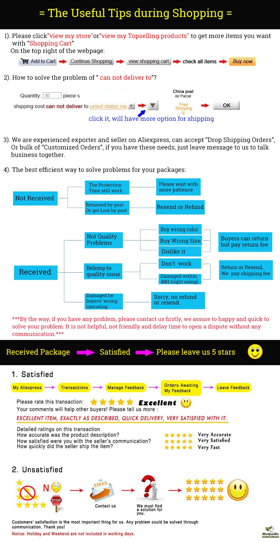 5. If you can not received your shipment within 30 days after payment, please contact us. We will track the shipment and get back to you as soon as possible with a reply, we assure to make you feel santisfied.