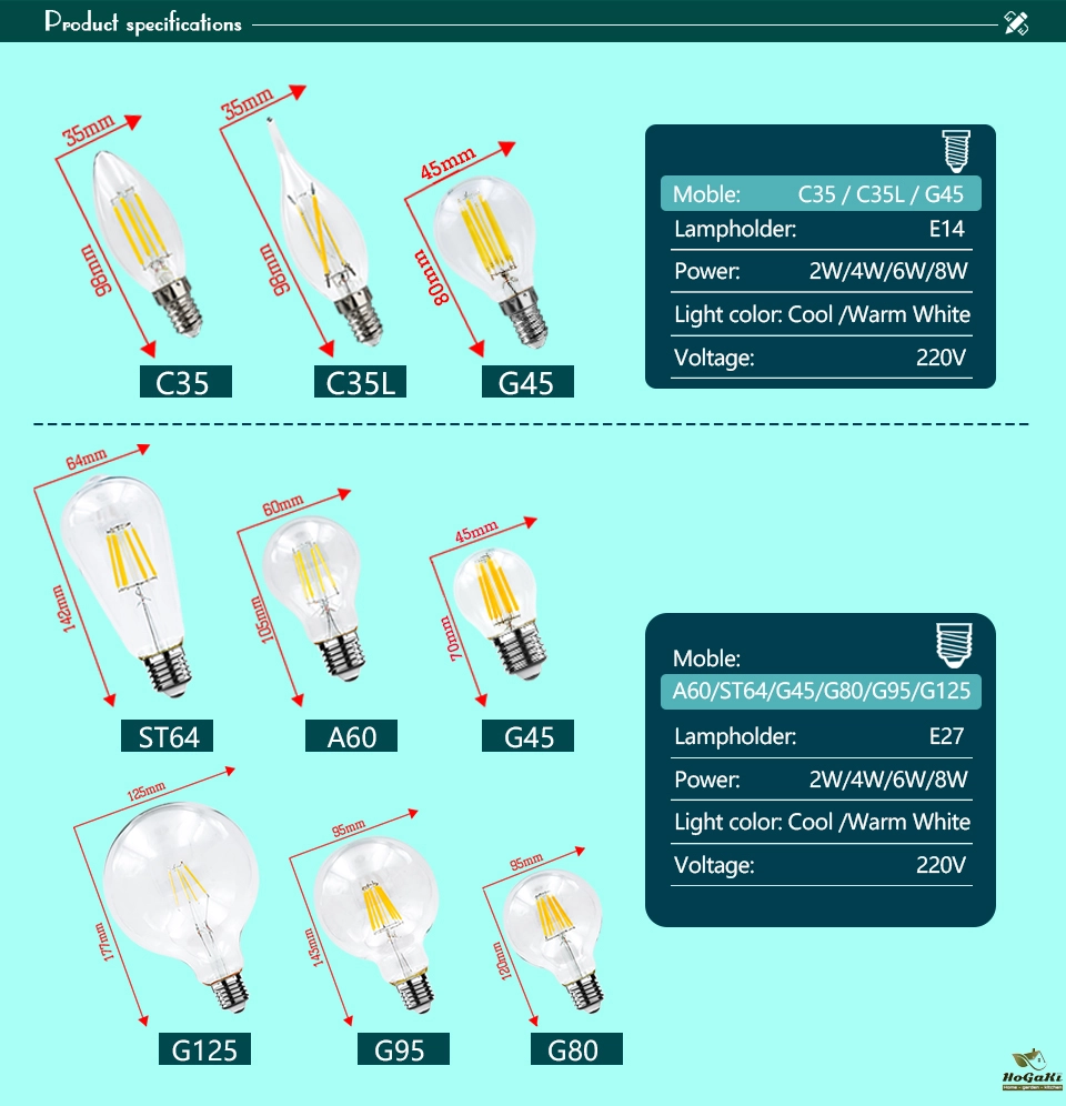 Base Type:E14(C35,C35L,G45);E27(A60 ,ST64,G45,G80,G95,G125)