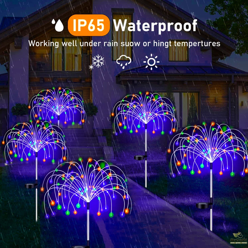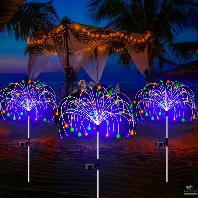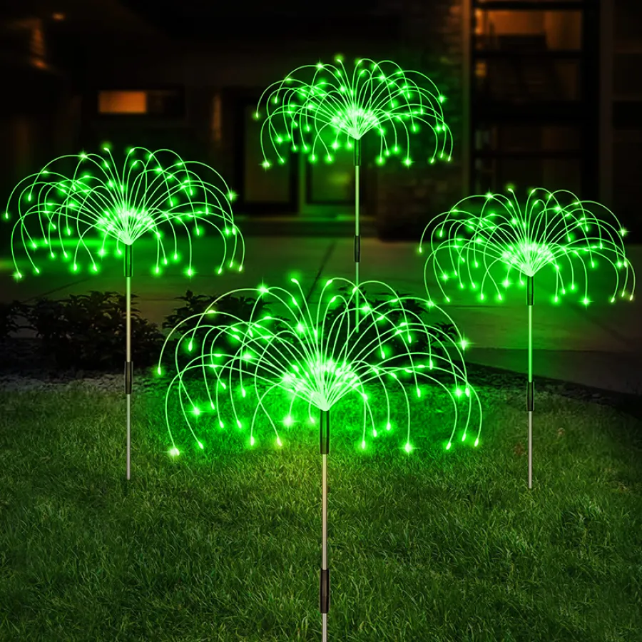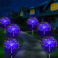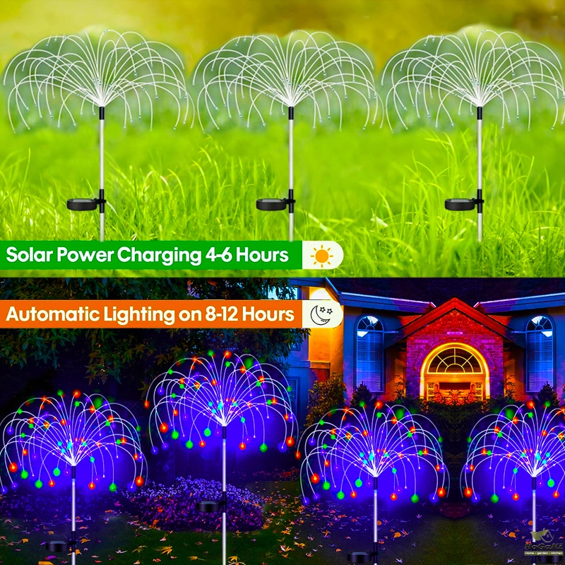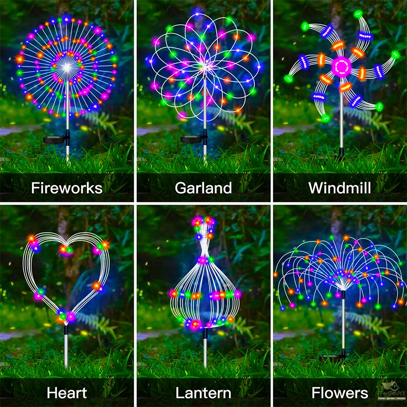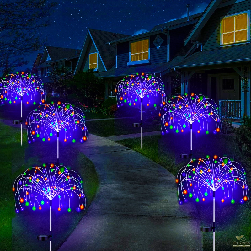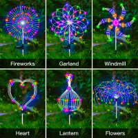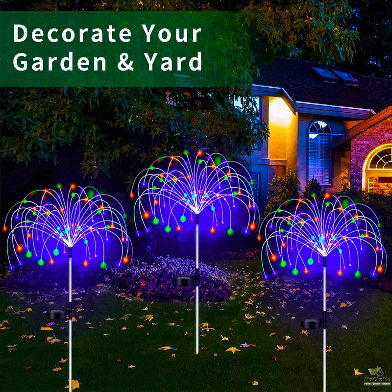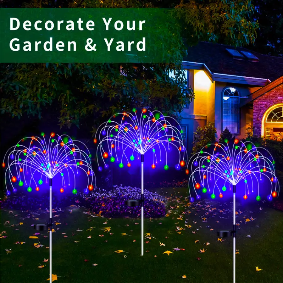 flexible and high-quality copper wires. You can flexibly DIY any shape, such as flowers, trees, fireworks, Ferris wheel, heart, spiral, sphere. These solar fireworks lights are decorated with colorful lights and are perfect for your garden, yard, lawn, flower beds, terraces, sidewalks, and driveways.