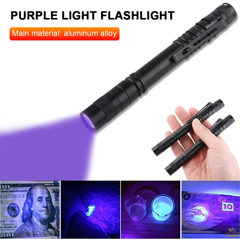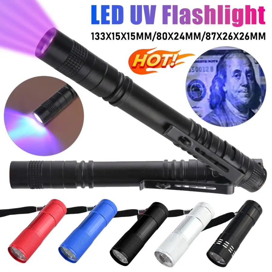 Feature: 1. Portable with Clip: Equipped with a clip, this UV LED flashlight is easy to carry and can be attached to your clothing or bag for convenient use on the go. 2. Anti-Slip and Waterproof: This torch features anti-slip, wear-resistant, and standard waterproof design. 3. Simple Operation: Designed with a simple one-switch mode, the LED UV penlight is easy to operate. 4. Portable Mini Size: With a shape resembling that of a pen and measuring only 13.3cm in length, this flashlight is portable and easy to carry around. 5. Versatile Functions: This UV LED flashlight can be used for counterfeit detection, trace inspection, fluorescent agent detection, and more. Specification: Main material: aluminum alloy Product color: black Product size: approximately 133x15x15mm/5.23x0.59x0.59inch Net weight of product: approximately 27g Switch: Tail cover push type switch (ON/OFF) Waterproof grade: IPX4 daily life waterproof Power supply: 2 * AAA battery (not included in sales) Power: 3W Zoom mode: None, fixed focus Application fields: special lighting industries such as currency verification, tracing, amber authenticity verification, forensic medicine, fluorescent anti-counterfeiting bill seals, etc. Note: