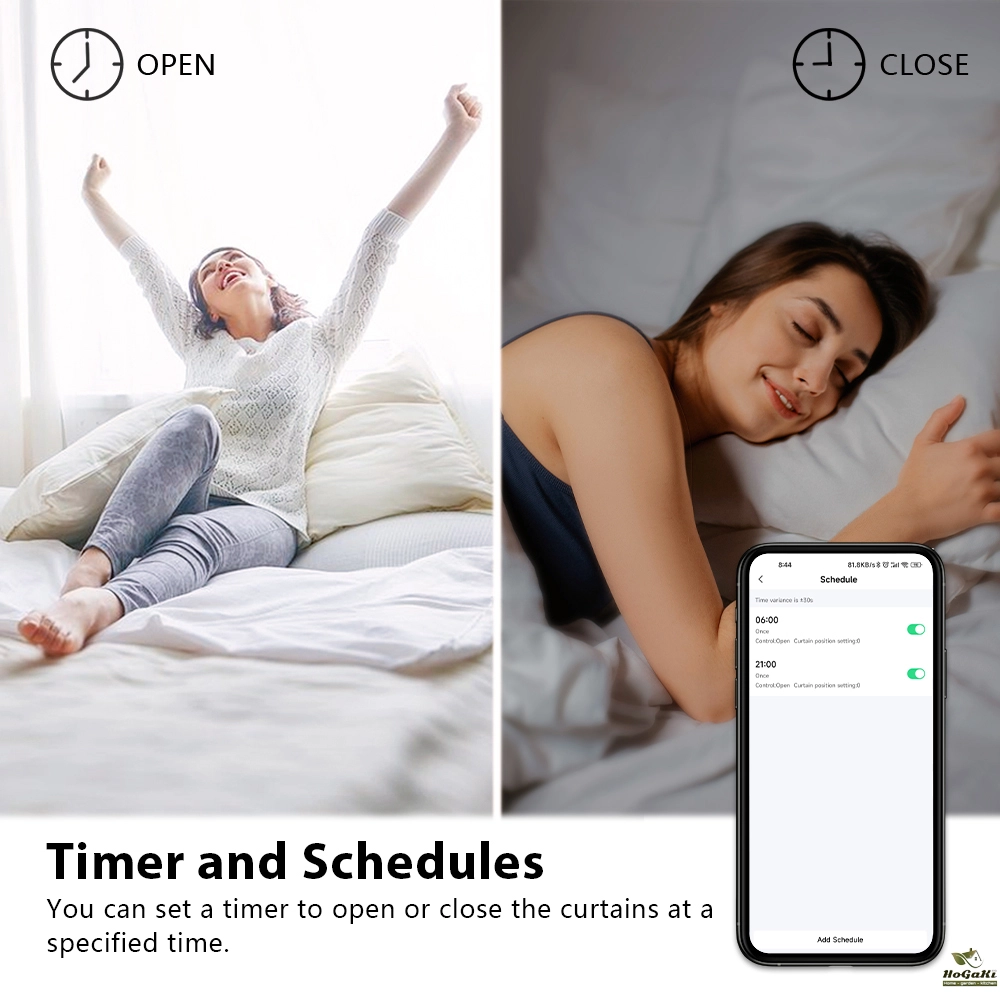 - Timer and Schedule: You can set a timer to open or close the curtains at a specified time.