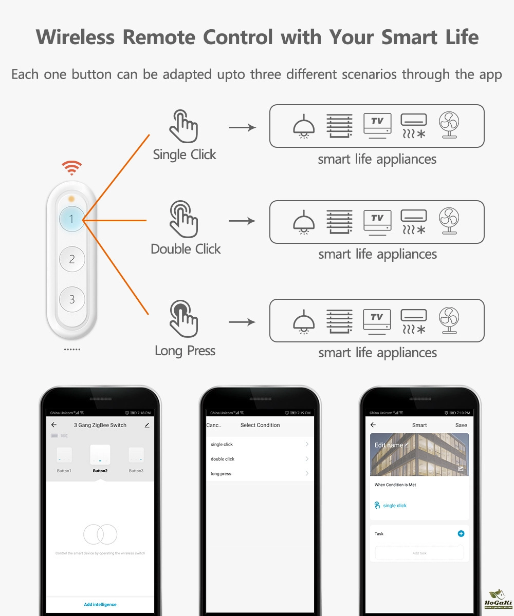 With this Tuya ZigBee Remote and a Tuya ZigBee Hub, you can control all the smart devices in your Smart Life or Tuya App. (Please be noted the Tuya ZigBee Hub is a must!)