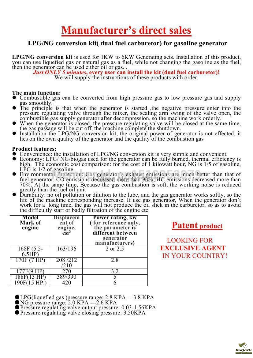 THE MAIN FUNCTION OF GAS PRESSURE REDUCING VALVE IS LOW PRESSURE GAS AND THE STEADY SUPPLY OF COMUSTIBLE GAS FROM HIGH - PRESSURE CHANGE REQUIRED TO BECOME A GENERATOR. THE PRICIPLE IS THAT THE GENERATOR IS STARTED,THE SUPPLY GENERATORS TO NORMAL OPERATION . WHEN THE GENERATOR IS TURNED OFF, THE PRESSURE REDUCING VALVE ASLO WILL BE CLOSED,CUT OFF THE GAS CHANNEL TO COMPLETE THE SHUTDOWN. THIS KITS IS INSTALLED ,THE GENERATOR DOES NOT AFFECT THE ORIGINAL GENERATOR OF POWER, ITS POWER DEPENDS ON THE QUALITY OF THE GENERATOR'S OWN QUALITY AND COMBUSTION GASES.