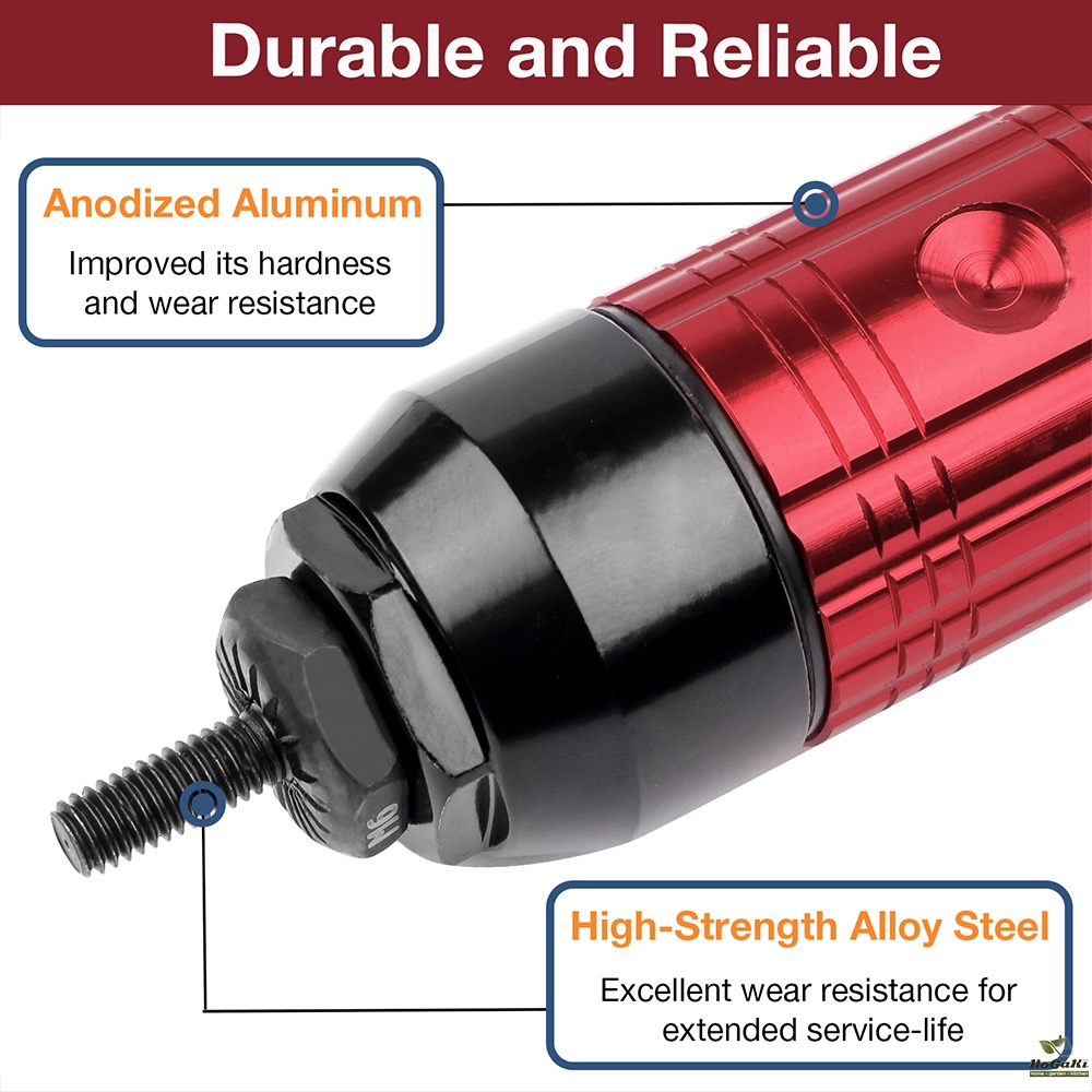 1. High-quality materials: The riveting gun is made of high-quality aluminum alloy, aluminum alloy shell, and alloy steel pipe head, which has high hardness and durability.