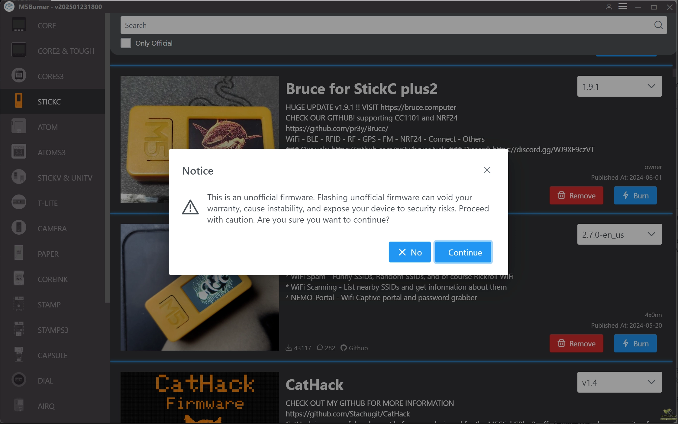 Solutions: "Bruce for StickC plus2" This is an unofficial firmware. Flashing unofficial firmware can void your warranty, cause instability, and expose your device to security risks. Proceed with caution.