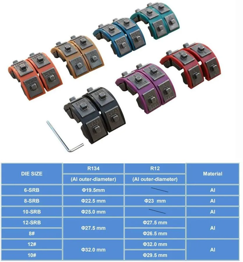 【7 DIES WHOLE SET】This A/C Hose Crimper Tool comes with 7 die sets for hose sizes: #6 (5/16" Reduced Barrier), #8 (13/32"), #8 (13/32" Reduced Barrier ), #10 (1/2"), #10 (1/2" Reduced Barrier), #12 (5/8"), #12 (5/8" Reduced Barrier), and base for bench mounting