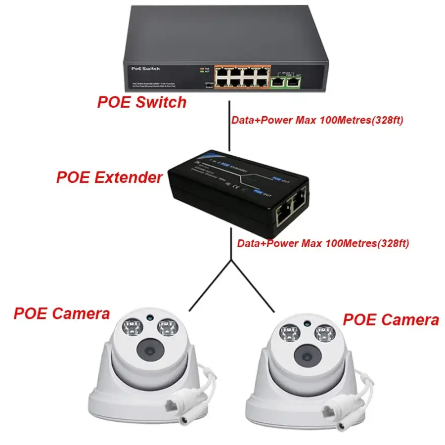 2 Port PoE extender can forward both Ethernet and PoE power for 1 terminal equipment via Cat5 ,Cat5e,Cat6,Cat6e,UTP cable.
