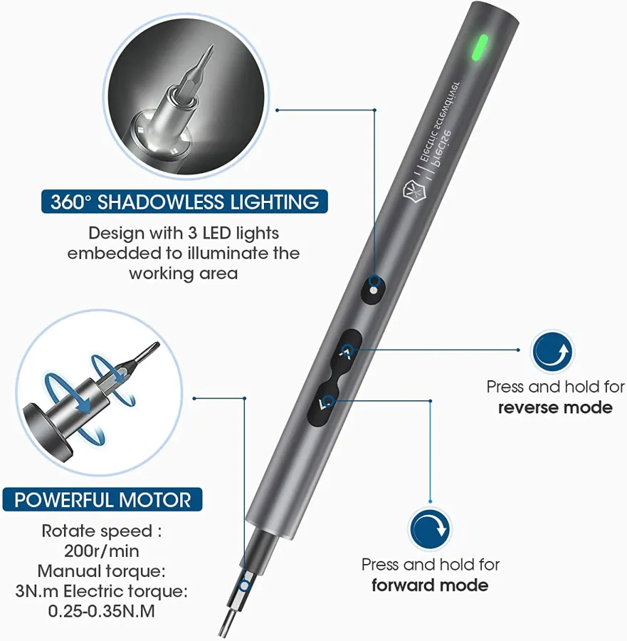 【LED Light & USB Charging】360° Shadow-less lighting design, embed 3 LED lights to brighten the working area. Strong magnetic bits design, the screwdriver will firmly absorb the screwdriver bits. Enter the cordless handheld electric precision screwdriver, making complex assemblies quickly and easily.